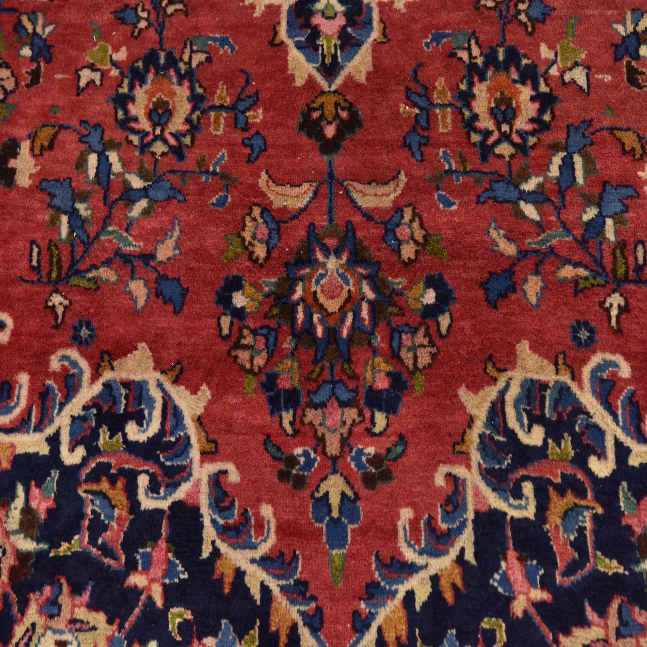 Primary color is Red. Colors in this rug include: Red, Beige, Black, Blue, Brown, Green, Ivory, Navy Blue, Orange, Pink.
