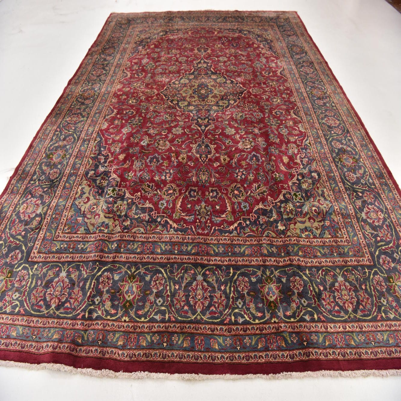A large 10x13 rectangular red Persian rug with an intricate medallion pattern and a dark blue floral border.