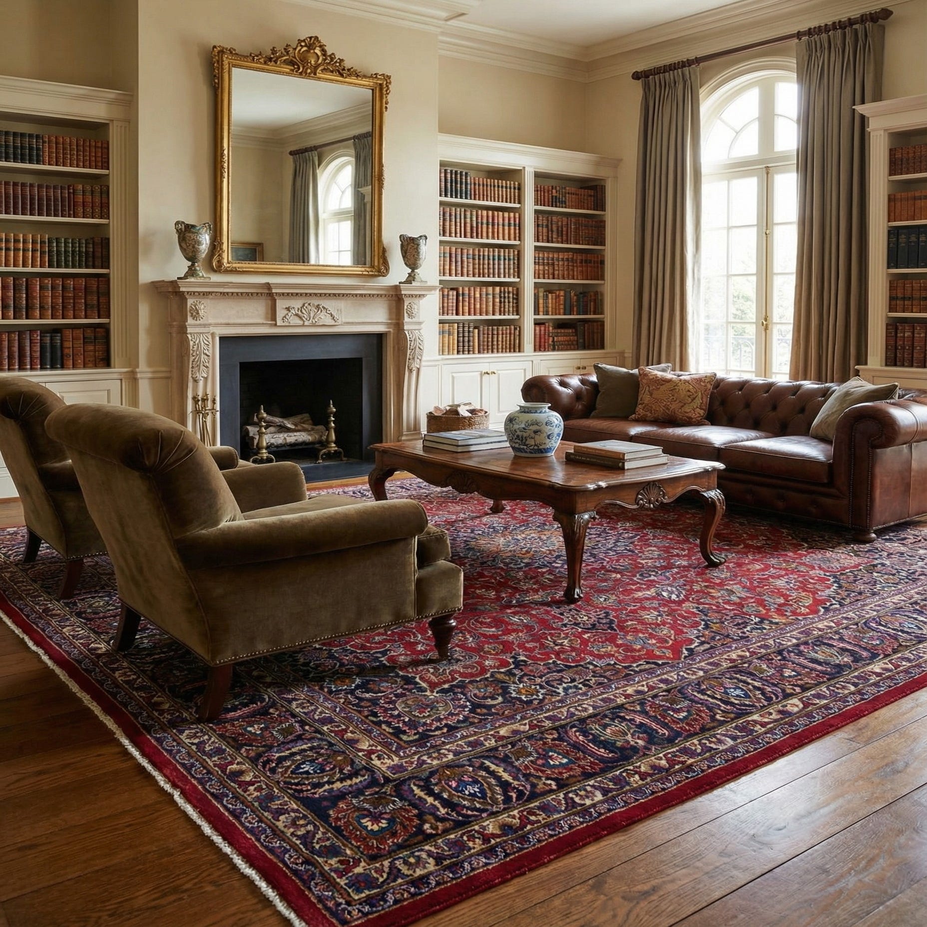 A 10x13 rectangular red Persian wool rug with a central medallion and intricate floral patterns, perfect for a living room.