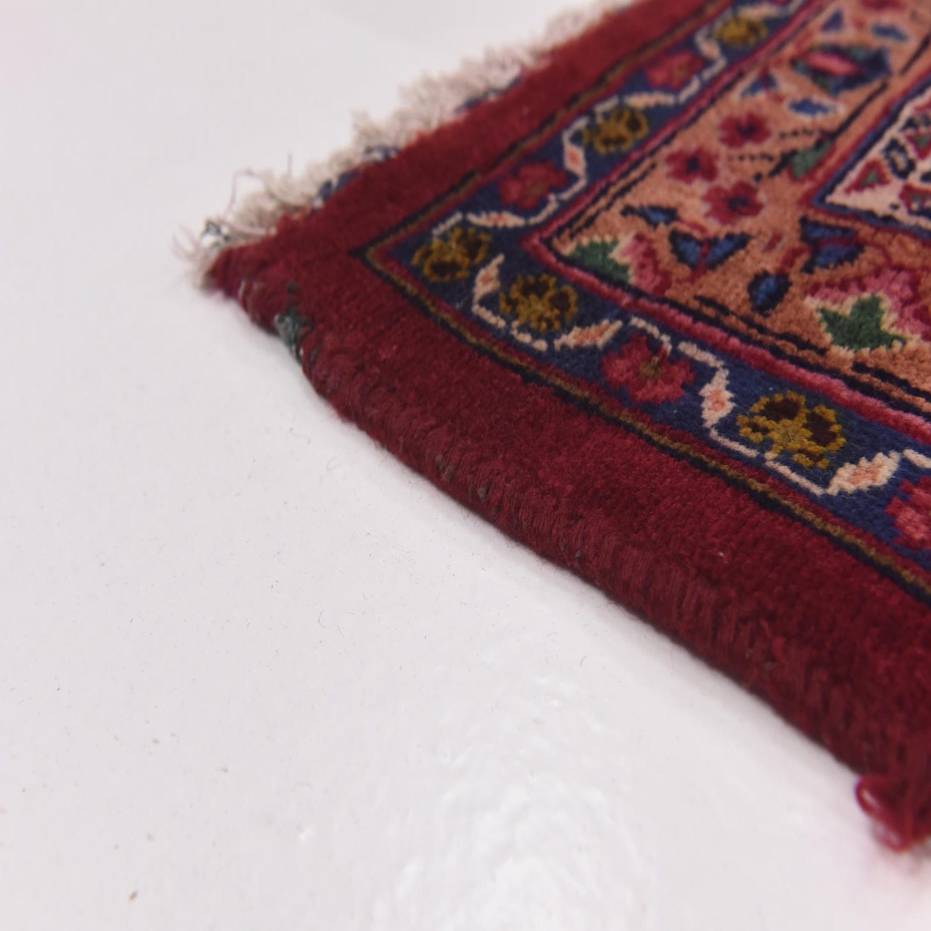 Suitable for traditional, classic, or formal interiors, this Mashad rug would be well-placed in a living room, dining area or grand entryway, where its scale and presence command attention. The textured woolen pile provides a comfortable underfoot experience, while the robust construction ensures the rug can withstand high traffic areas. It pairs elegantly with wood furnishings, antiques, and rich textile fabrics, grounding spaces with its timeless appeal and adding a sense of warmth and history to a modern home's decor.