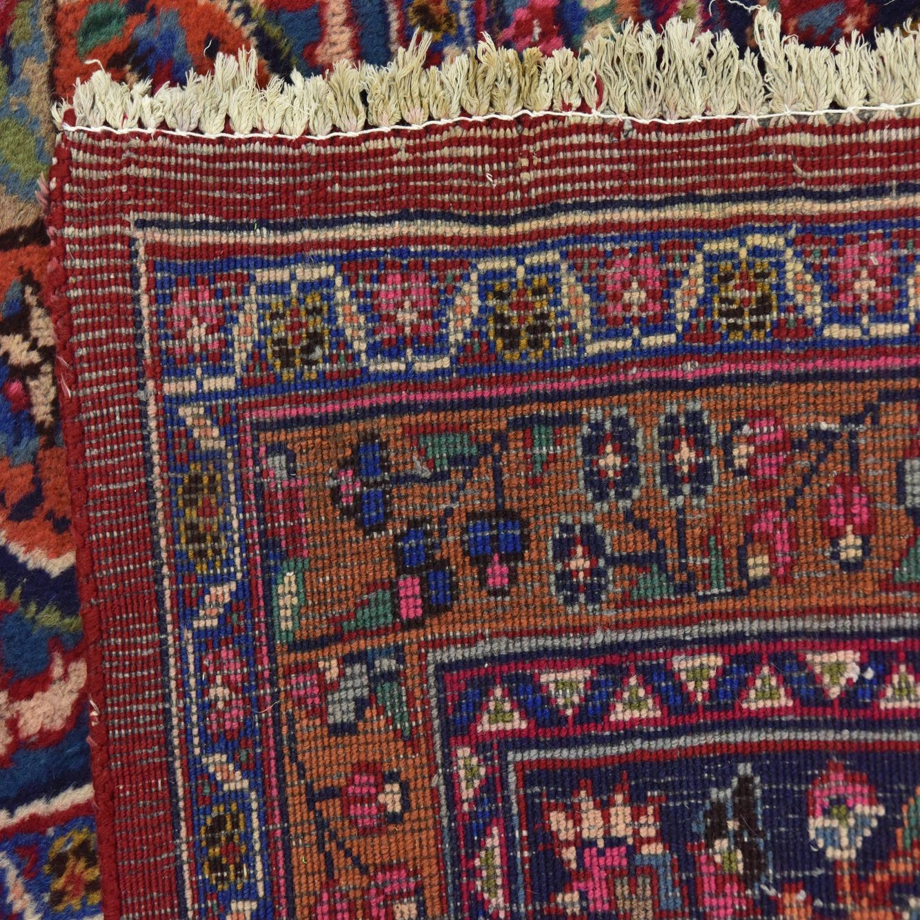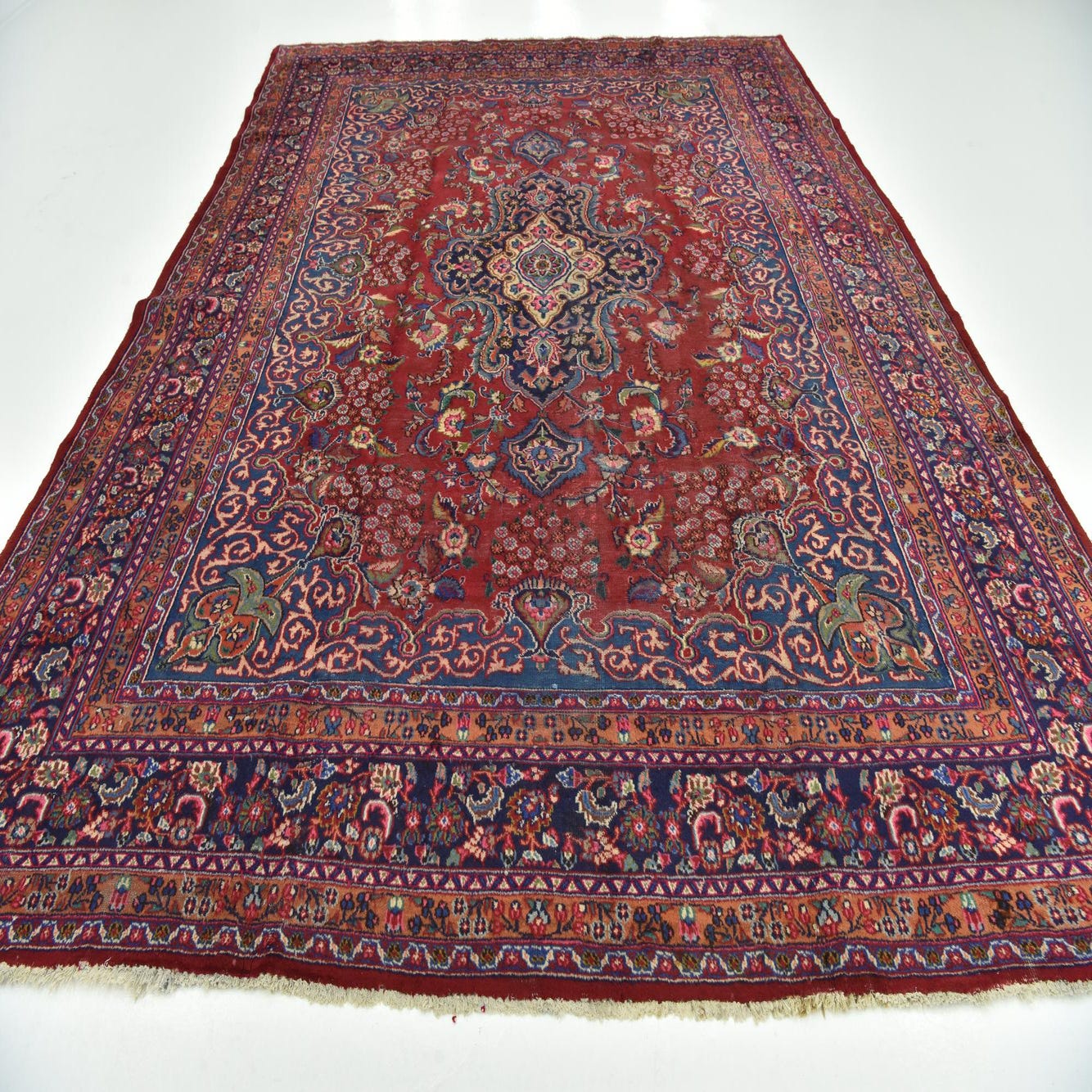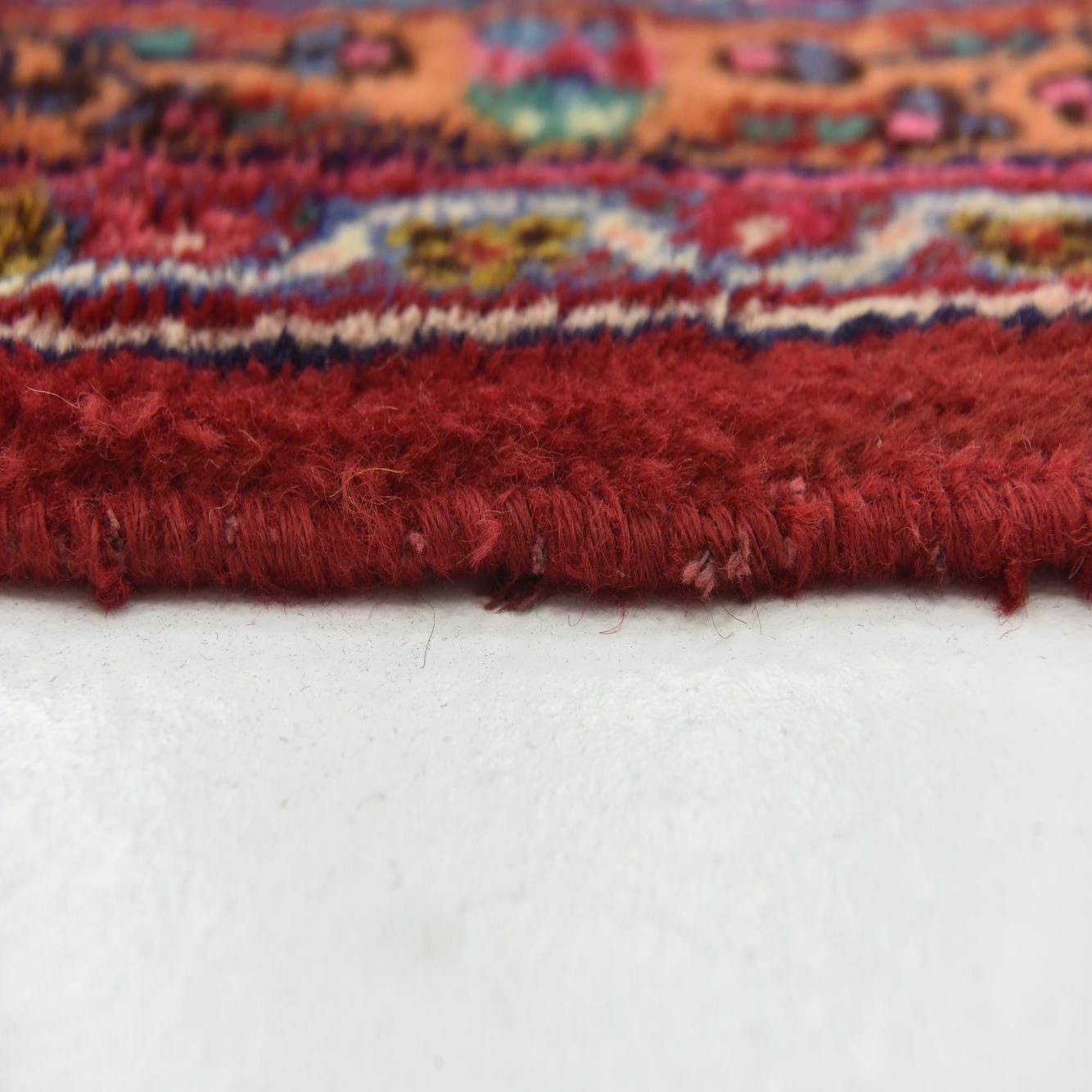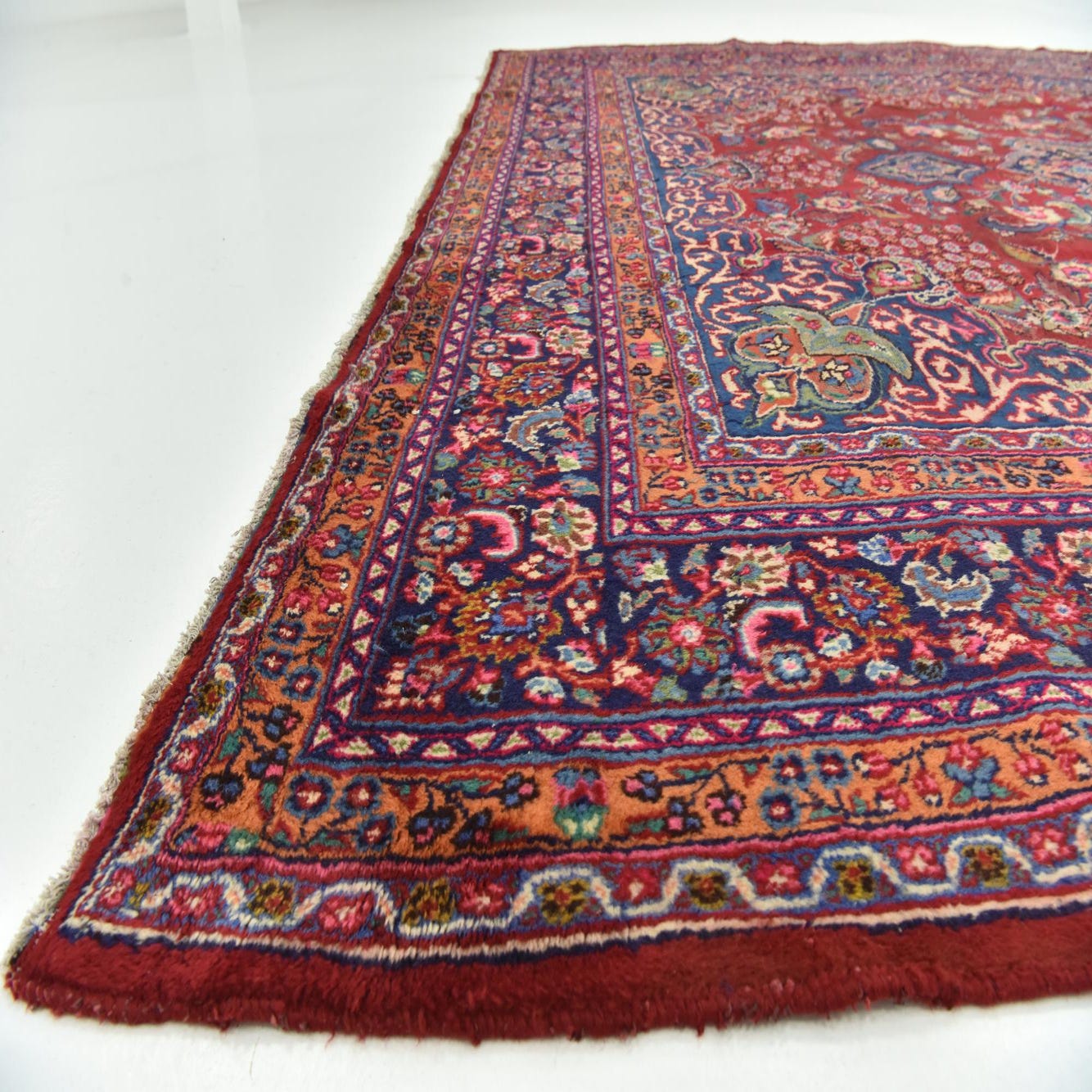 The Mashad Collection rug is a hand-knotted piece meticulously crafted from 100% wool, offering a dense and plush texture that adds warmth and comfort underfoot. Spanning a generous 10x13 feet, this rug is designed to anchor larger spaces and create a rich focal point in any room. With a decidedly red background, the rug's palette is interwoven with hues of beige, black, blue, brown, green, ivory, navy blue, olive, orange, pink, and yellow, creating a vibrant tableau that can harmonize with a wide range of color schemes.