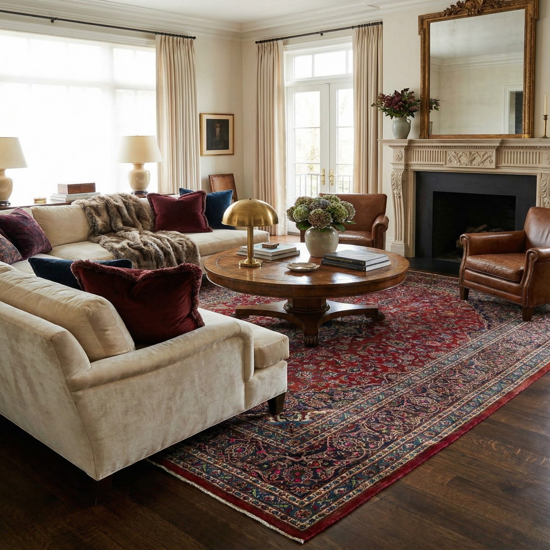 This traditional Persian-inspired rug works equally well in a formal living room beneath a seating group, under a dining table to ground a classic setting, or layered in a study or library with warm wood furniture and leather accents. It also brings color and texture to transitional interiors when paired with neutral upholstery and brass or antique finishes, or to eclectic rooms where layered patterns and jewel-tone accents are used to create depth.