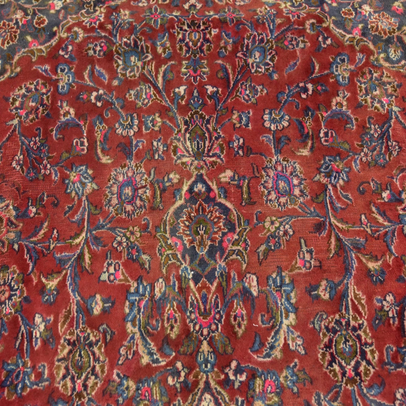 A large 10x13 rectangular Persian rug with a red field, intricate floral patterns, and a central medallion, framed by a multi-layered border in dark blue and red tones.