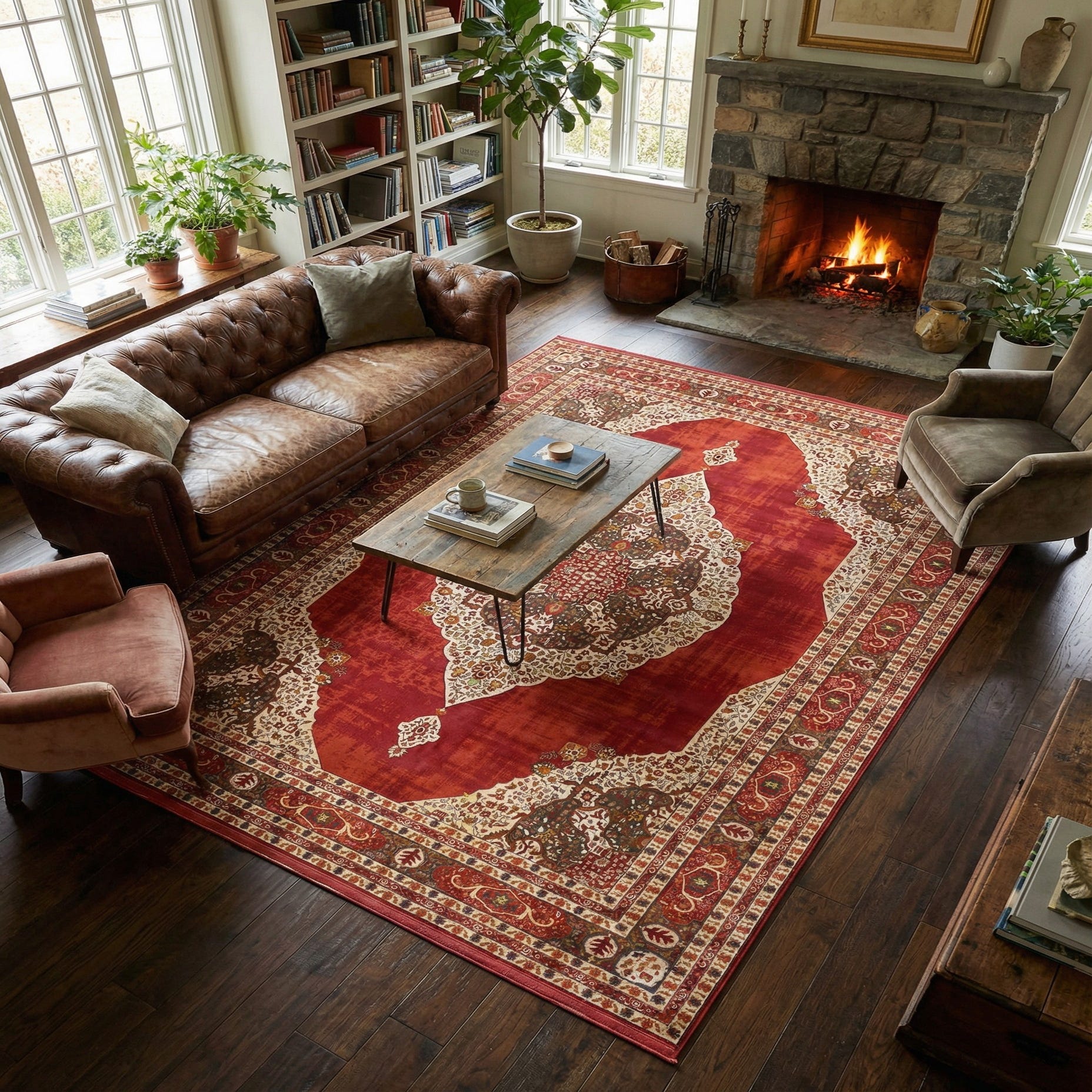 This piece anchors a formal living room or a dining area with classic wood furniture and leather seating, where the warm red and terracotta accents echo wood and metal tones. It also fits well in a study or entry hall to introduce color and pattern without overwhelming the space. For a more contemporary pairing, balance the ornate design with solid sofas, simple lines and neutral walls, and bring out the greens and ivories in pillows or decorative accessories to create a cohesive, layered look.