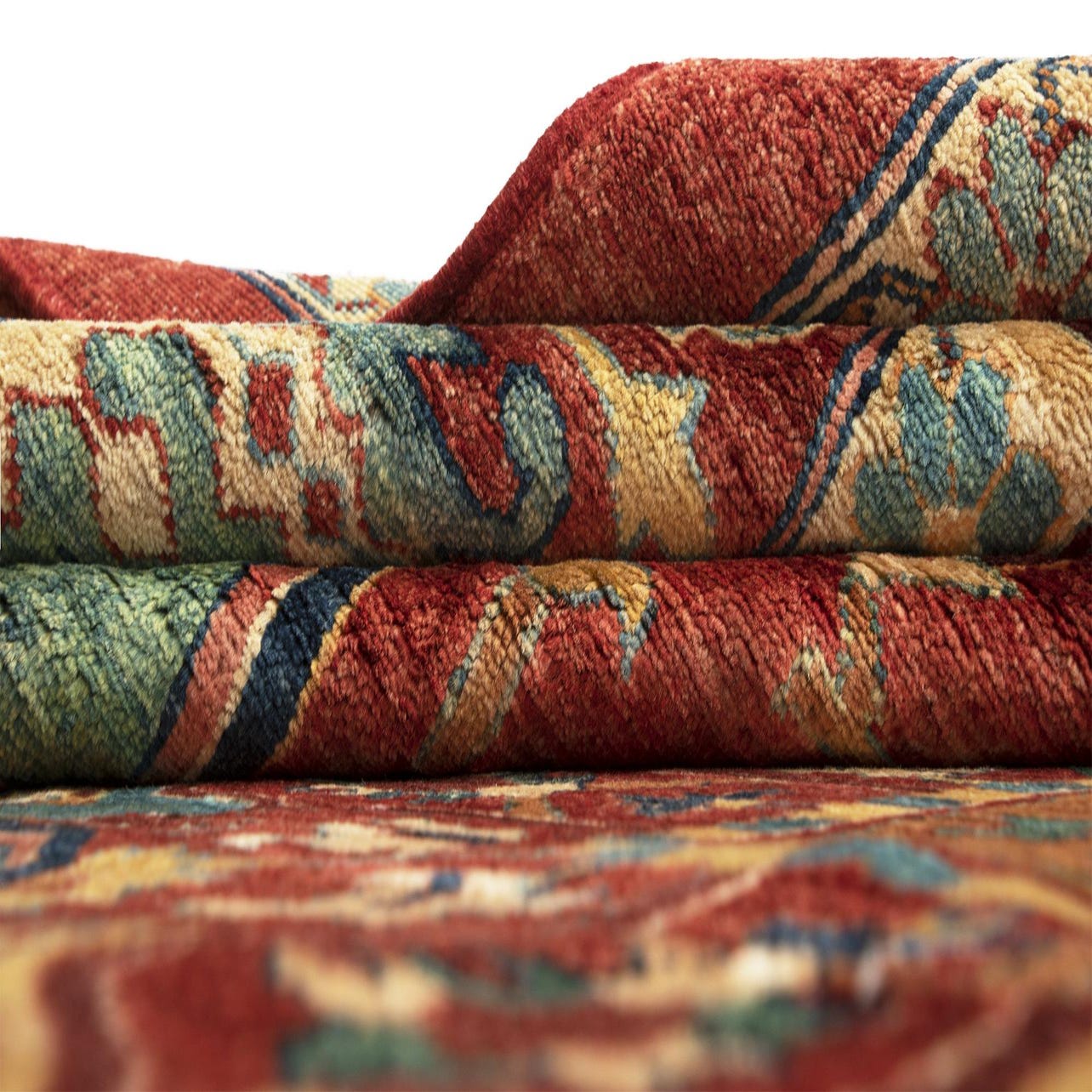 Primary color is Red. Colors in this rug include: Red, Red, Cream, Blue, Green, Brown.