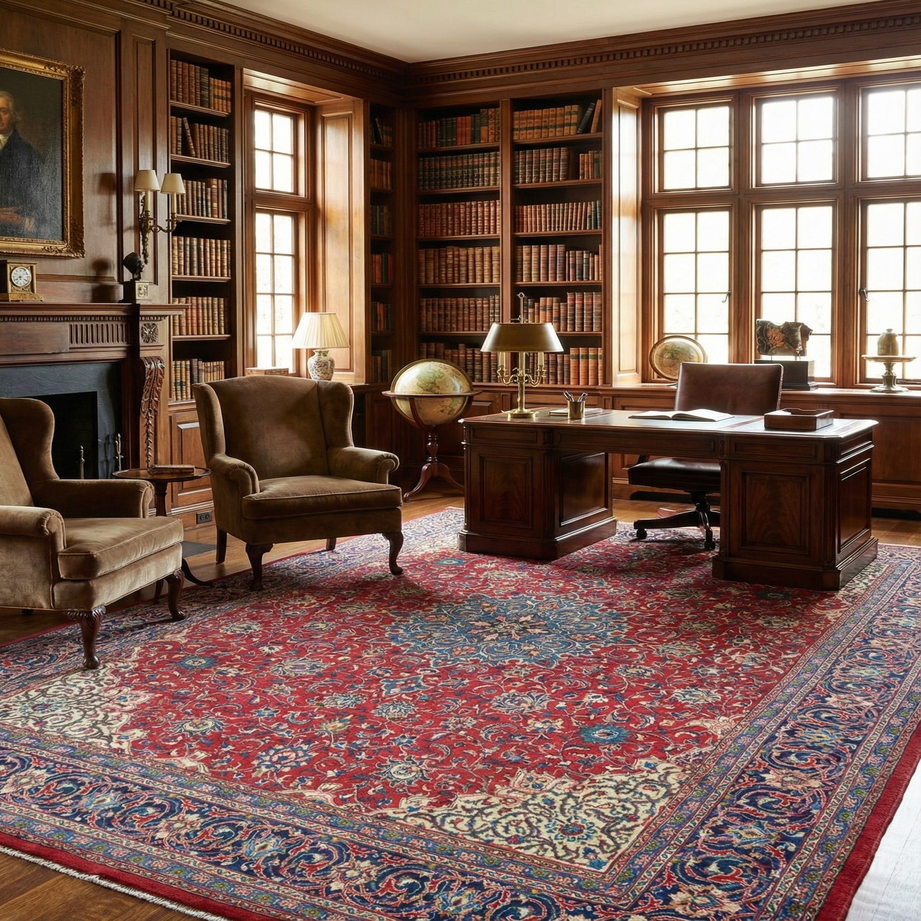 A large 10x13 rectangular red Persian rug with a central blue medallion and intricate botanical patterns, ideal for a living room.