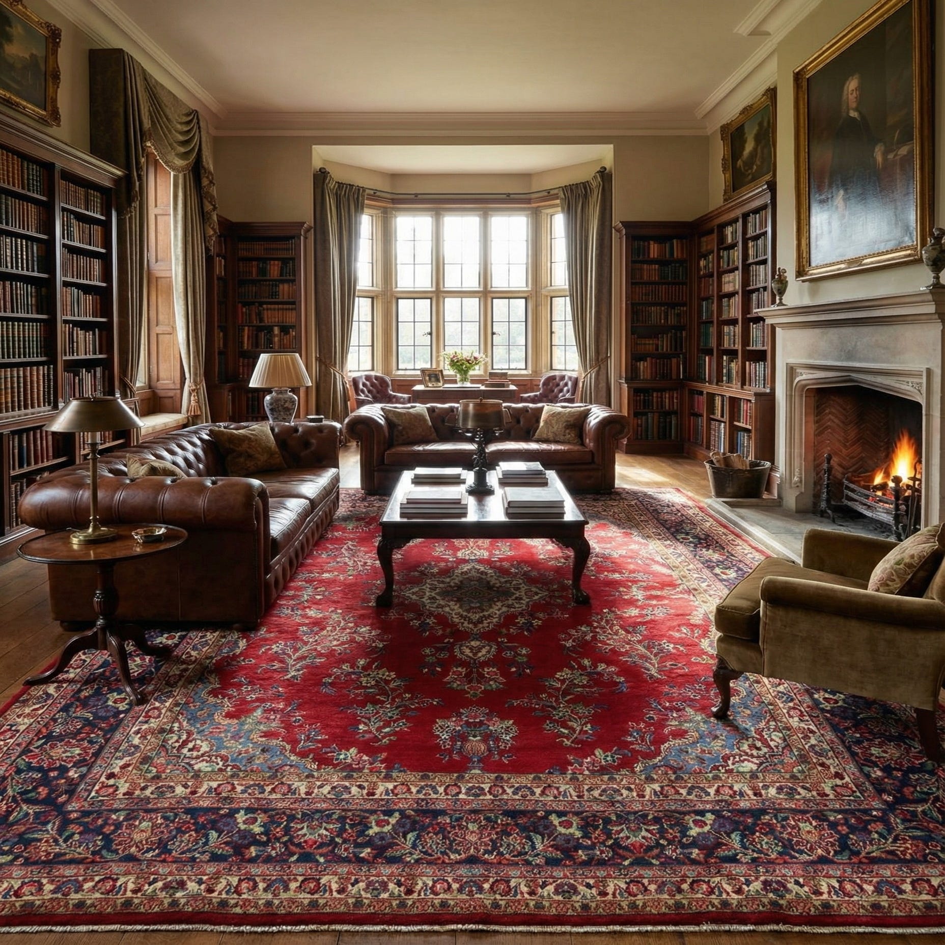 Suited for a variety of interior spaces, this rug would enhance the elegance of a formal living room, anchor a study with its dignified patterns, or add a warm, historical touch to a dining room. It pairs well with both antique and transitional furniture, offering a versatile base for a curated aesthetic. Its robust color scheme allows it to stand as a statement piece within a subdued color palette or to hold its own amid more vibrant decor.