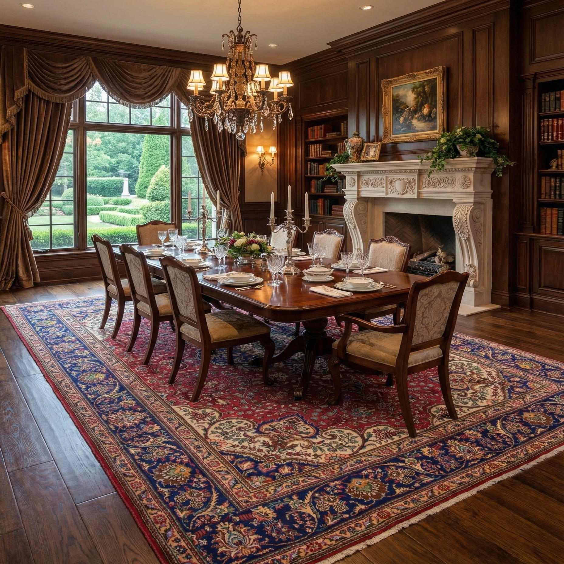 Because of its robust color scheme and elaborate pattern, this rug would work wonderfully in interiors that aim to create a stately and welcoming atmosphere. It is well-suited for placement in a formal living room, dining area, or a refined office setting. The timeless nature of this piece makes it versatile enough to complement both traditional decors with rich wood finishes and more eclectic interiors where it could serve as an anchor among diverse decorative elements.