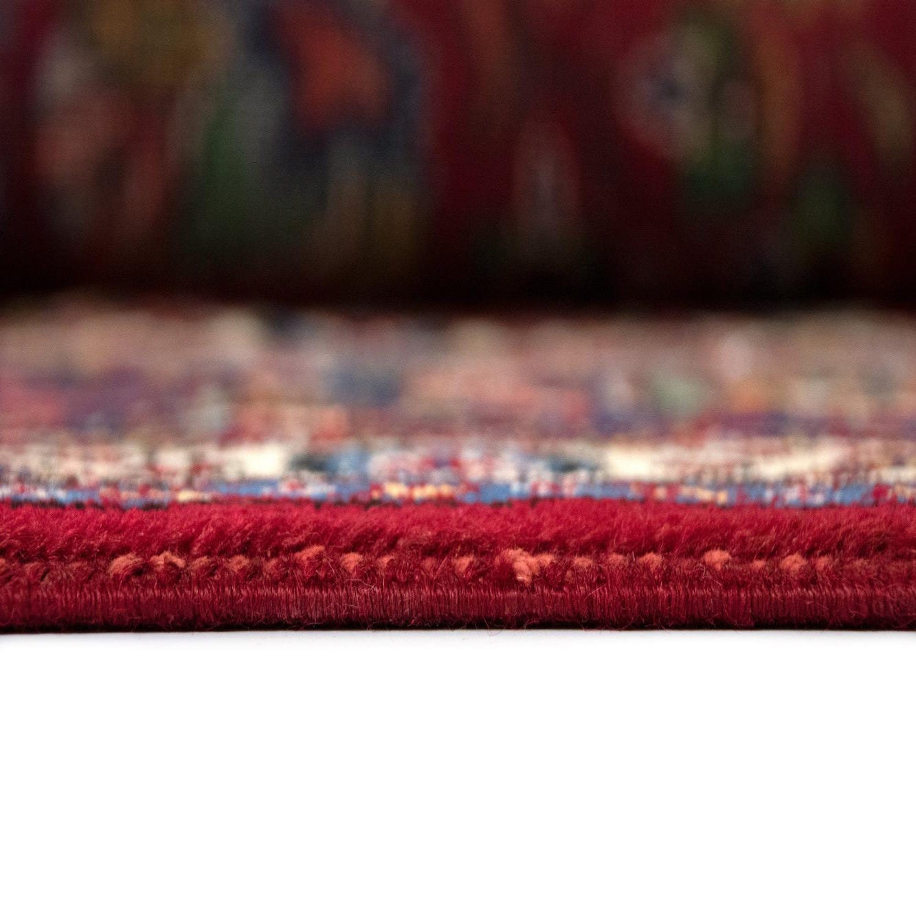 Primary color is Red. Colors in this rug include: Red, Blue, Cream, Green.