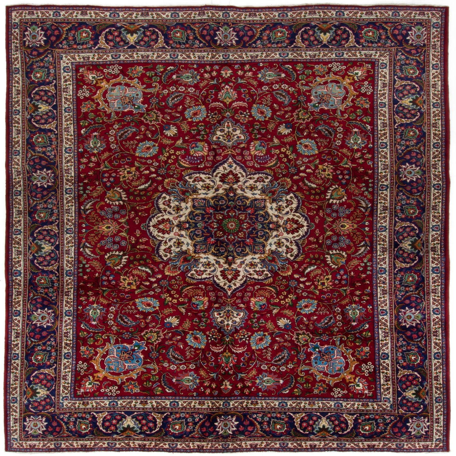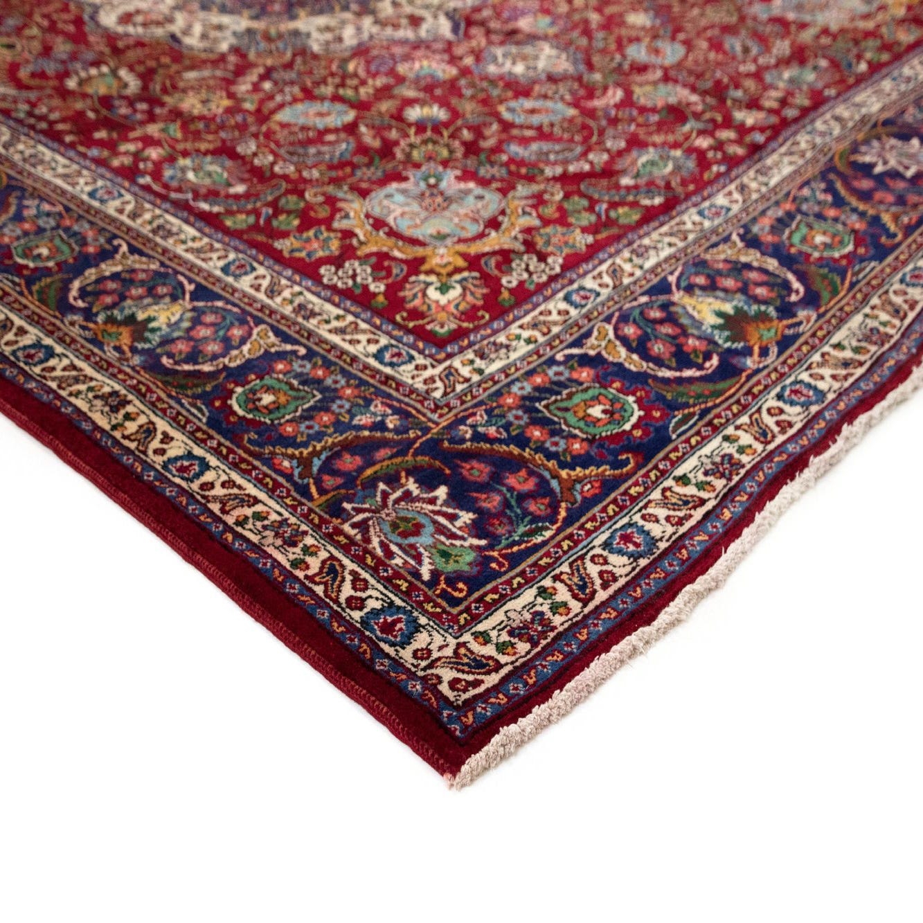 This Tabriz collection rug features a rich red background, providing a warm and inviting foundation for its intricate pattern. Hand-knotted from 100% wool, the rug showcases a sophisticated design that includes floral and geometric motifs. The central medallion, outlined in cream, is a focal point surrounded by an array of complementary details in shades of blue, green, and additional cream accents. The border is equally detailed, with a series of ornate patterns framing the piece and enhancing its traditional allure.