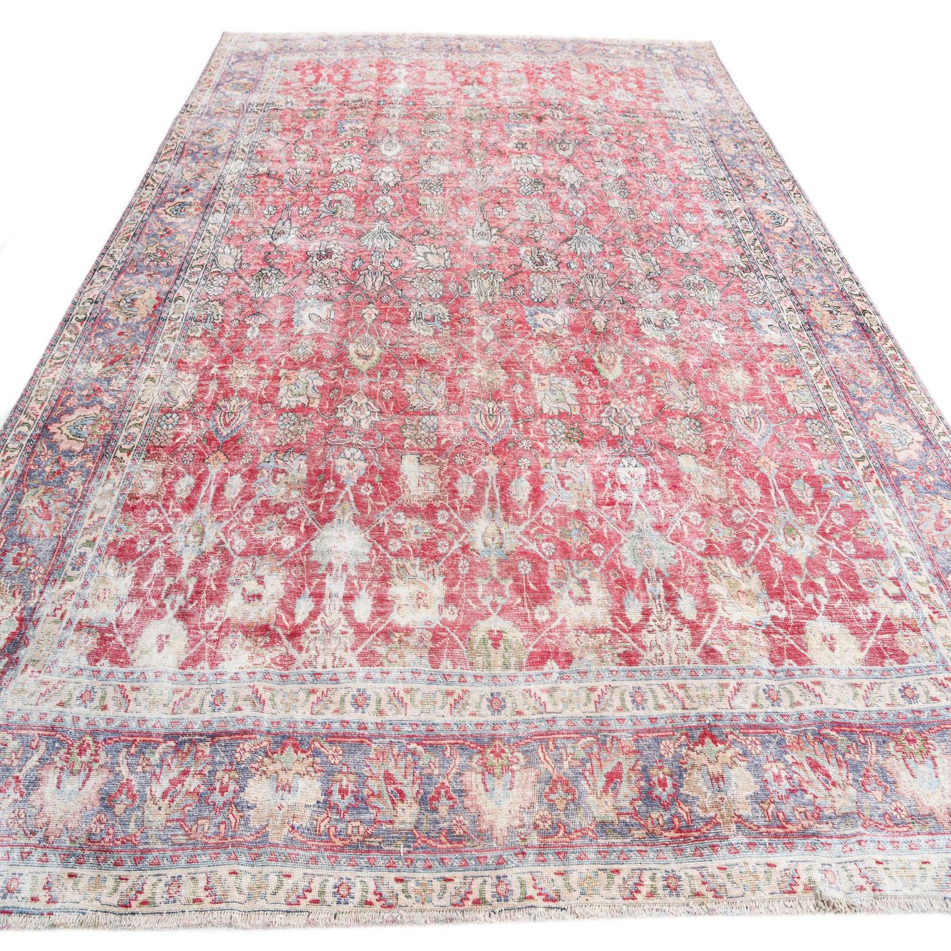 A 10x13 rectangular red Persian rug with a faded vintage look and intricate floral patterns, ideal for a living room.