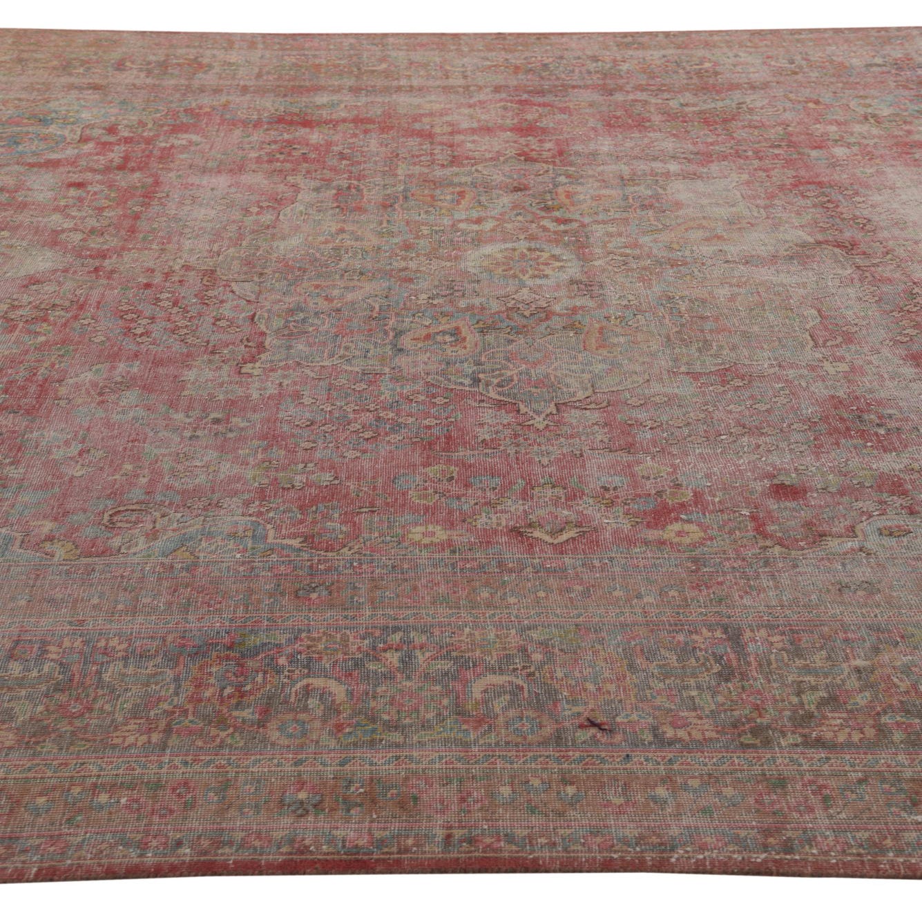 A large 10x13 rectangular red Persian area rug with a faded vintage medallion pattern and intricate border.
