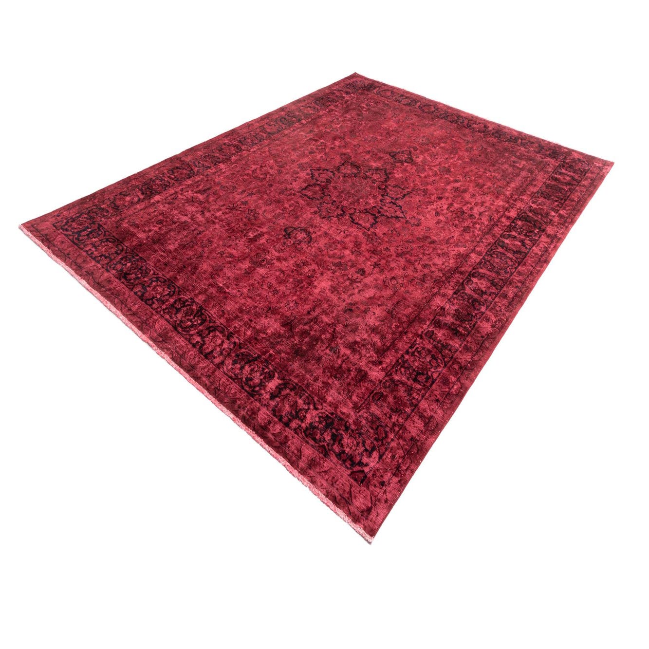 A 10x13 rectangular Vintage Royal Persian rug in deep red with intricate dark floral patterns and a bordered design, ideal for a living room.