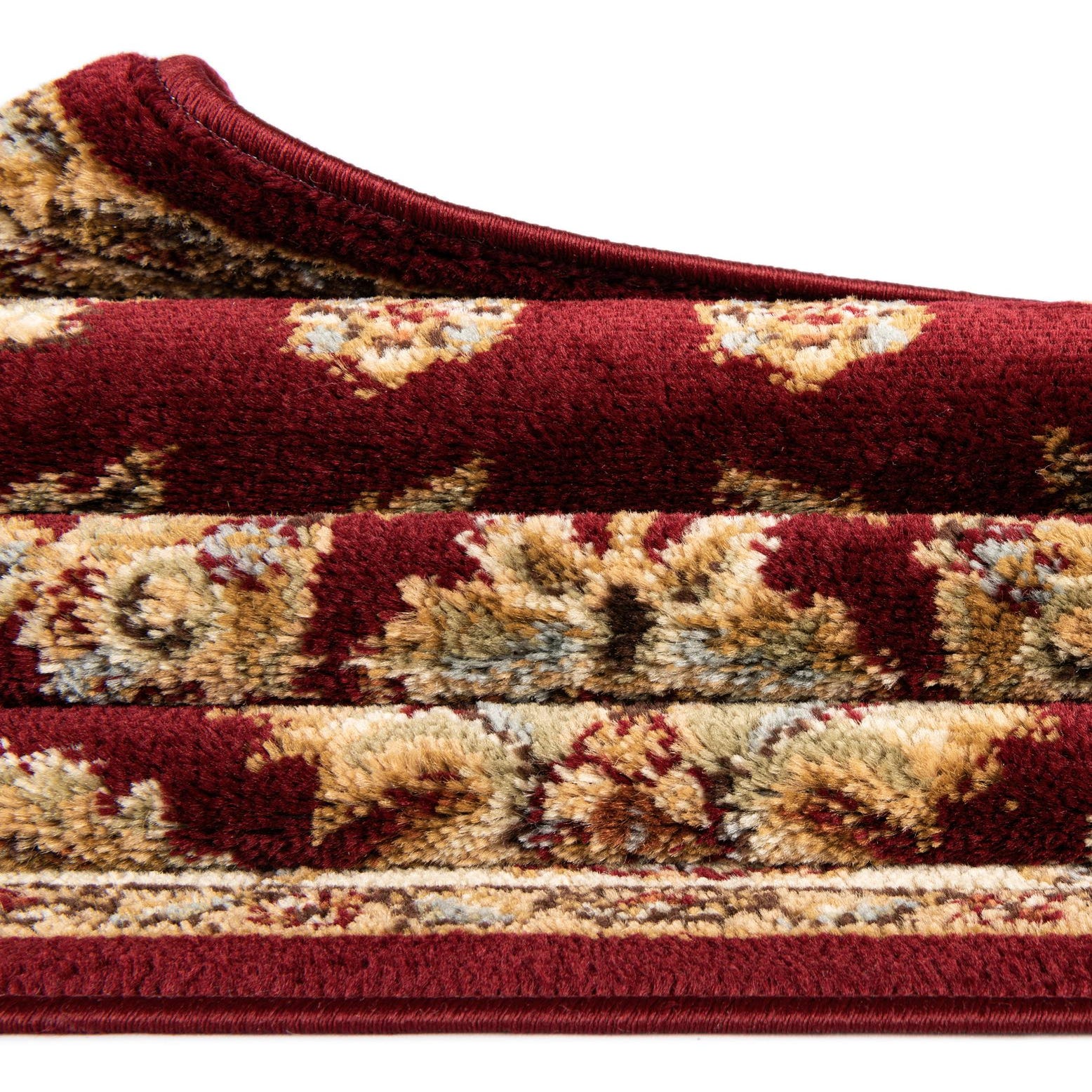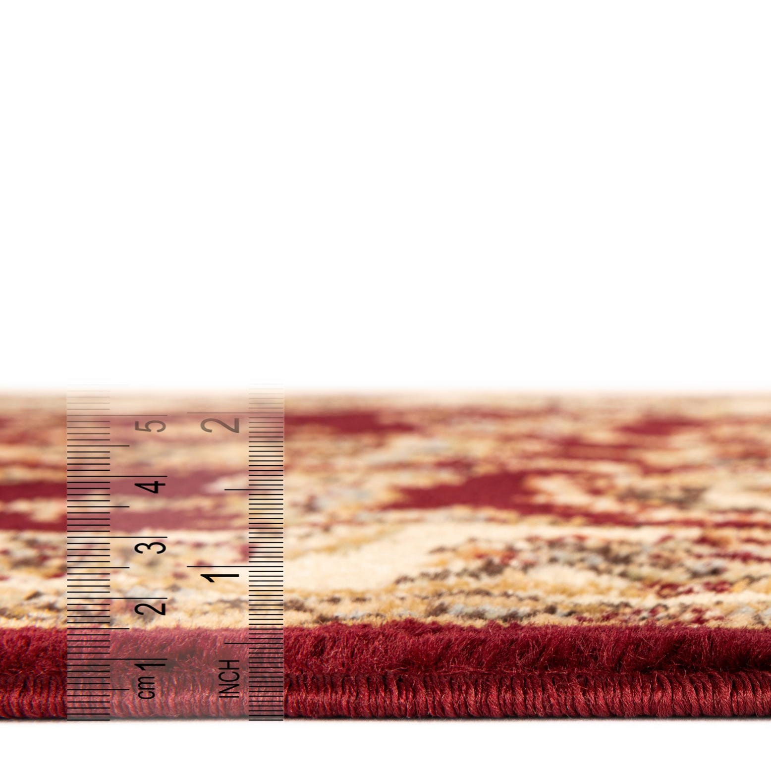 A richly patterned, Persian-inspired rug with a deep red field and a classic central medallion. Scrolling vines, palmettes and floral motifs are woven across the surface, framed by a warm tan/peach border that carries smaller floral repeats. Accents of brown, blue and green pick out the detailing and give the design depth and balance. The overall style leans traditional with a refined, formal feel that still works in updated interiors.