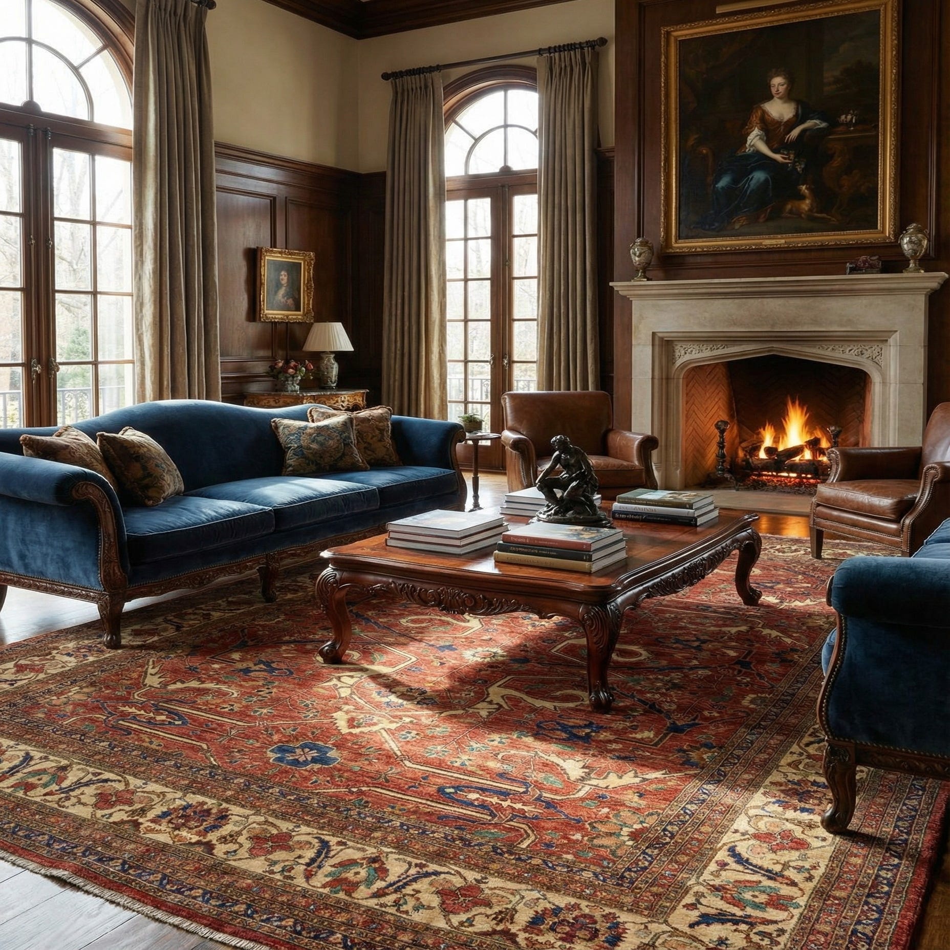 With its large dimensions and classic styling, this rug would be an excellent addition to spacious areas such as a formal living room, a grandiose dining space, or an executive office. Its traditional pattern and robust color palette make it a suitable centerpiece for interiors that lean towards classic, Victorian, or even rustic décor. The timelessness of the design also ensures versatility, allowing it to integrate seamlessly with both antique furnishings and more contemporary pieces that appreciate a touch of historic charm.