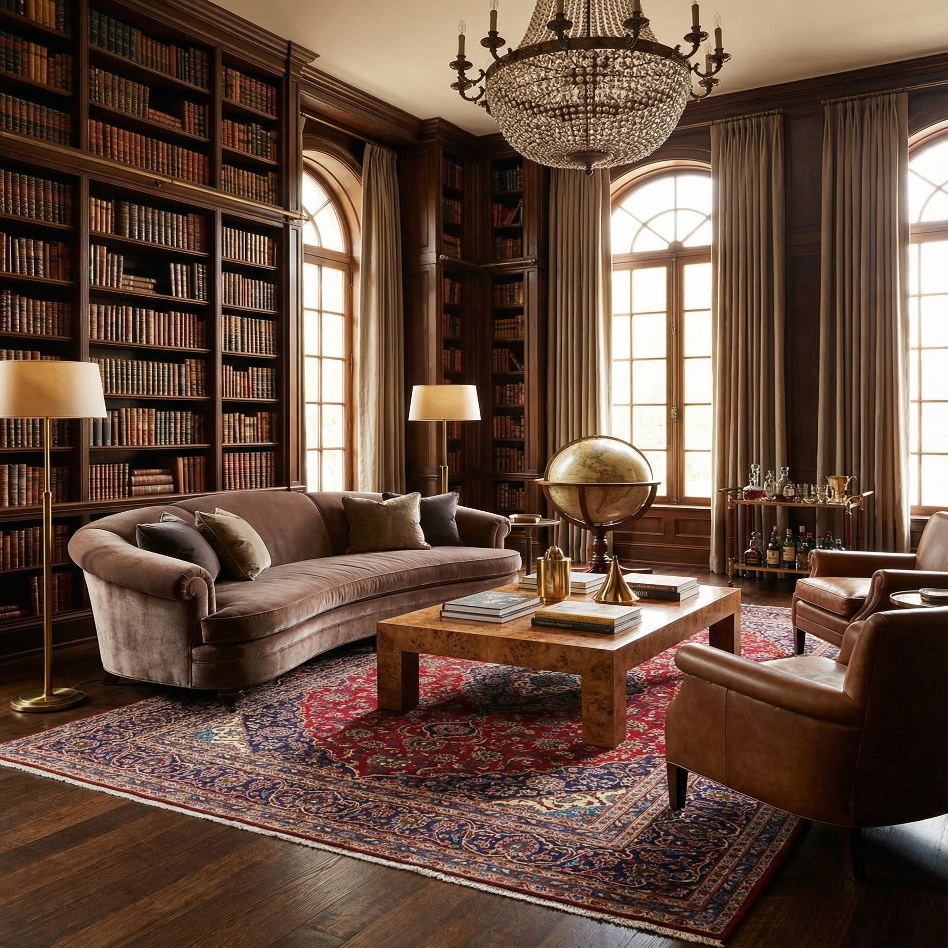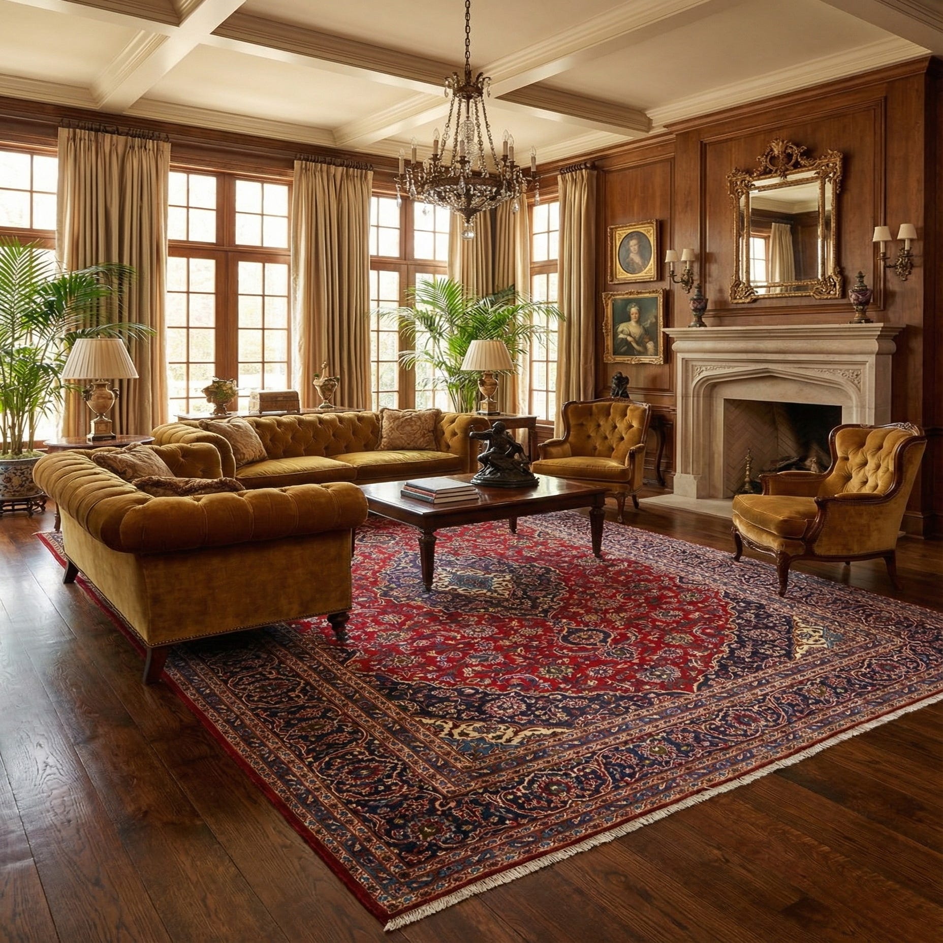 Given its generous size and classic pattern, this rug would complement a variety of interior design styles, from traditional to more contemporary settings that appreciate a touch of classic refinement. The deep colors provide an excellent base to anchor a room's furnishings, making it suitable for formal living areas, spacious dining rooms, or grand entryways. The woolen texture ensures a soft, plush feel underfoot while contributing to the piece's overall warmth and inviting aesthetic.