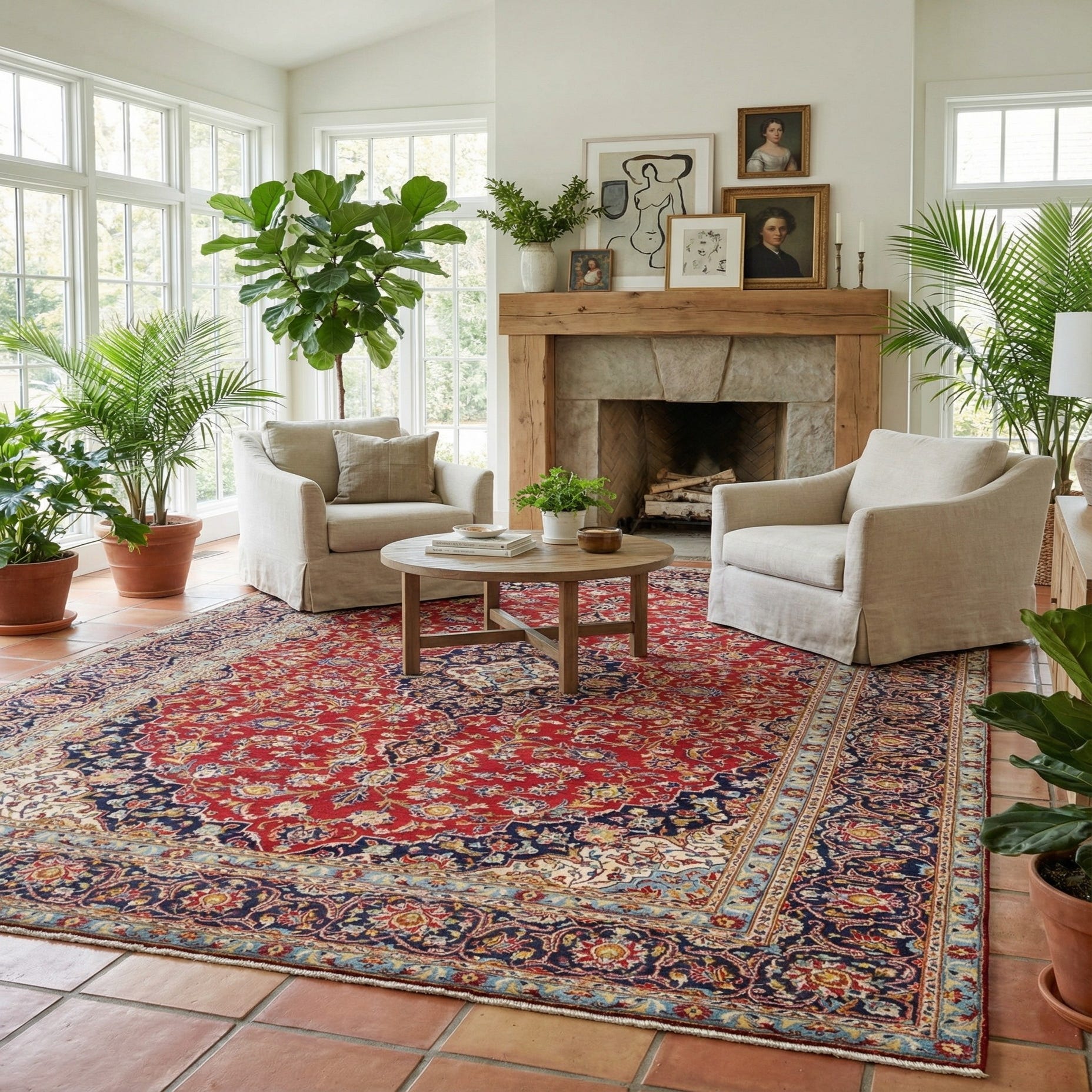 A large 10x14 rectangular Kashan Persian rug in deep red with an intricate navy and cream medallion and floral border.