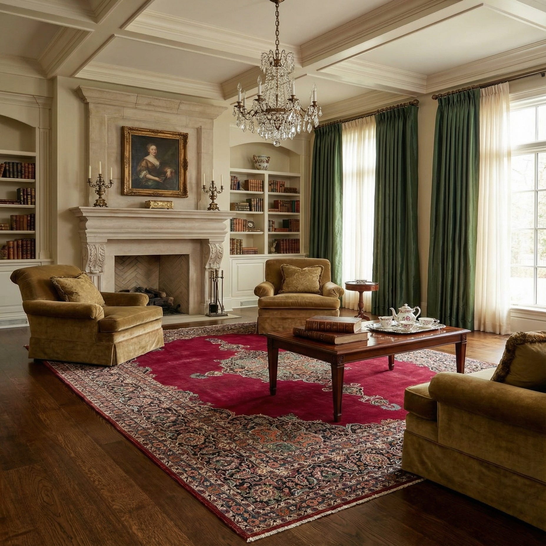 This rug's classic design and vibrant colors make it a versatile choice for various interior design scenarios. It would complement traditional settings, adding warmth and elegance to living rooms, dining areas, or large halls. Its stately presence is equally suited to anchor contemporary spaces that embrace a blend of modern and classic elements. The distinctive style and rich colors of this piece would provide a striking contrast against neutral furnishings, or it could serve as a cohesive element in a more eclectic décor, tying together diverse colors and patterns.