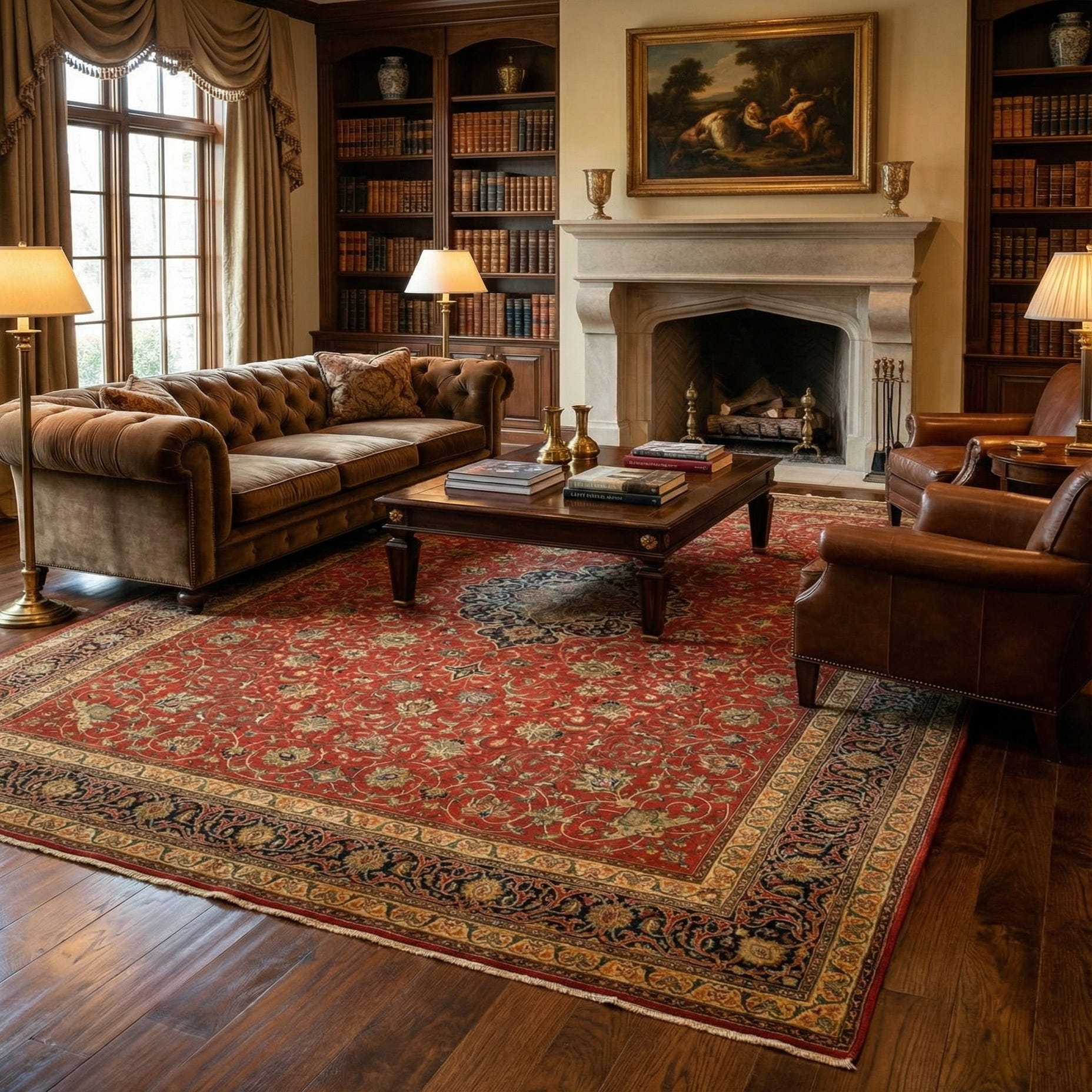 A large 10x14 rectangular Persian Tabriz rug with a rich red field, intricate floral patterns, and a central medallion in black and gold, framed by a detailed border.