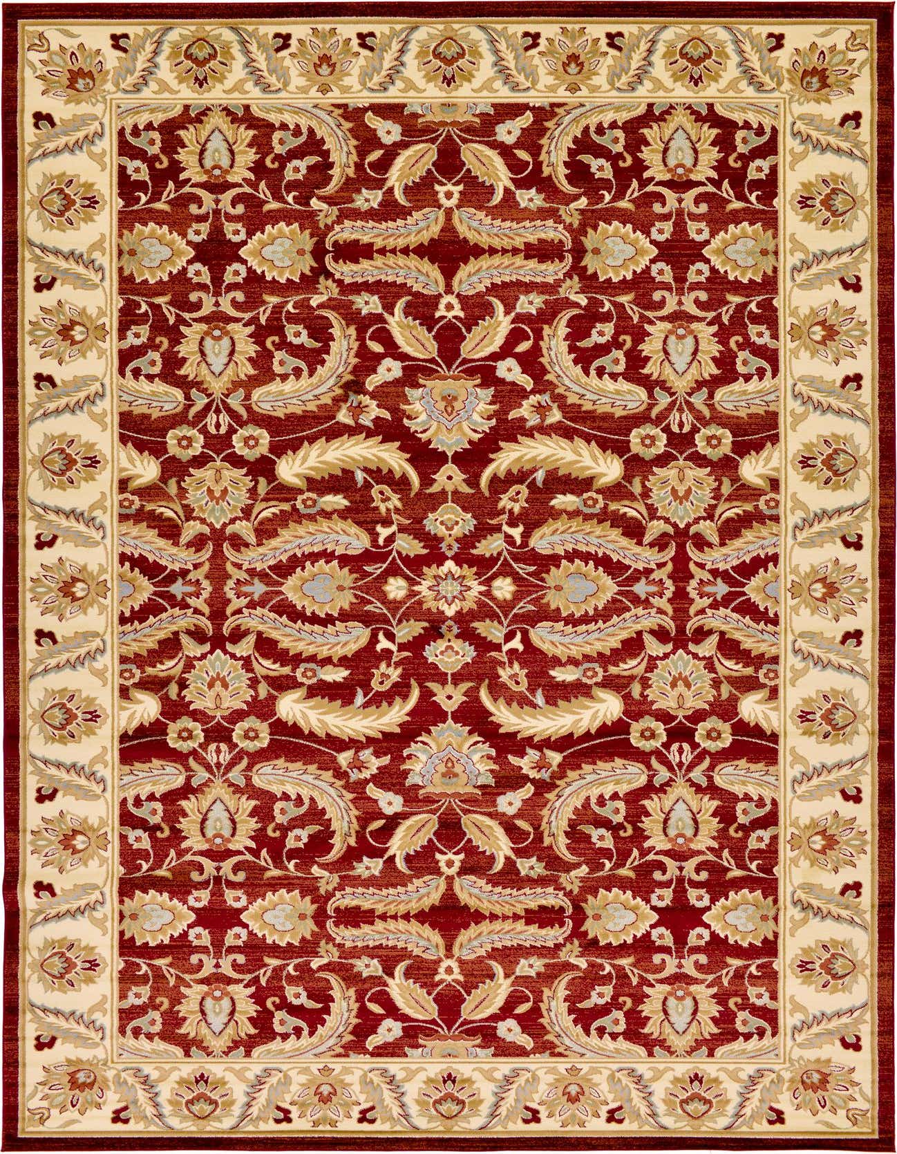 Primary color is Red. Colors in this rug include: Red, Cream, Light Blue, Light Green, Rust Red, Tan, Brown.