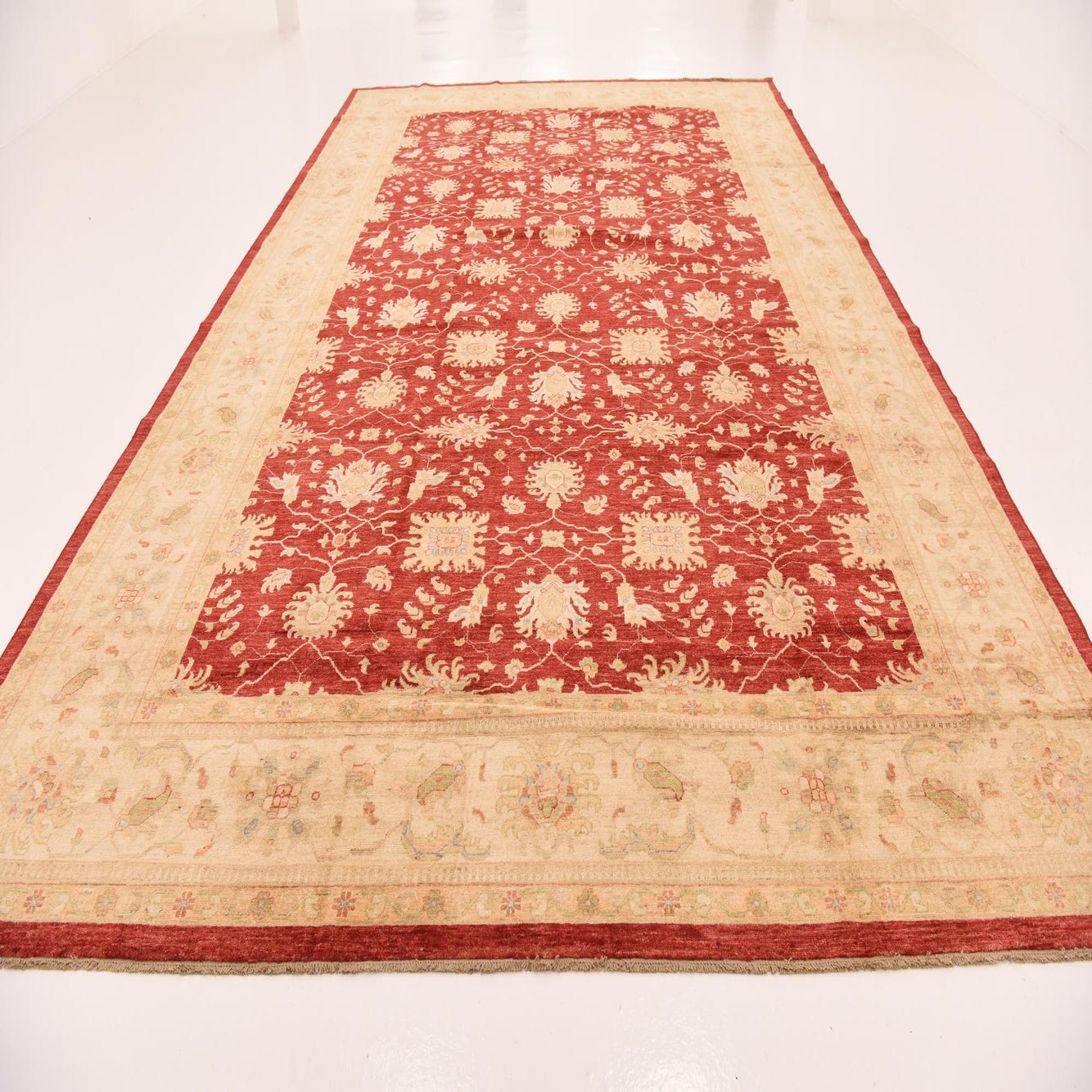 A large 10x16 rectangular red traditional rug with an intricate botanical and floral pattern, framed by a wide beige border.