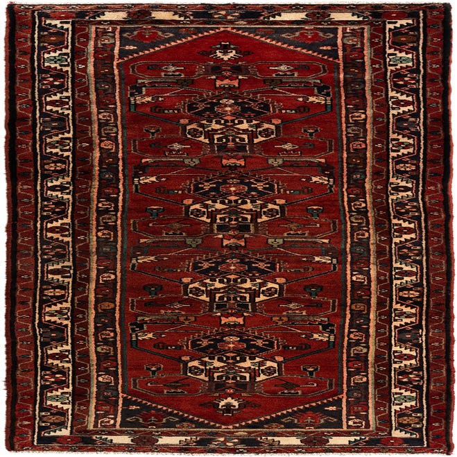 Primary color is Red. Colors in this rug include: Red, Red, Dark Blue, Cream, Brown, Light Blue.