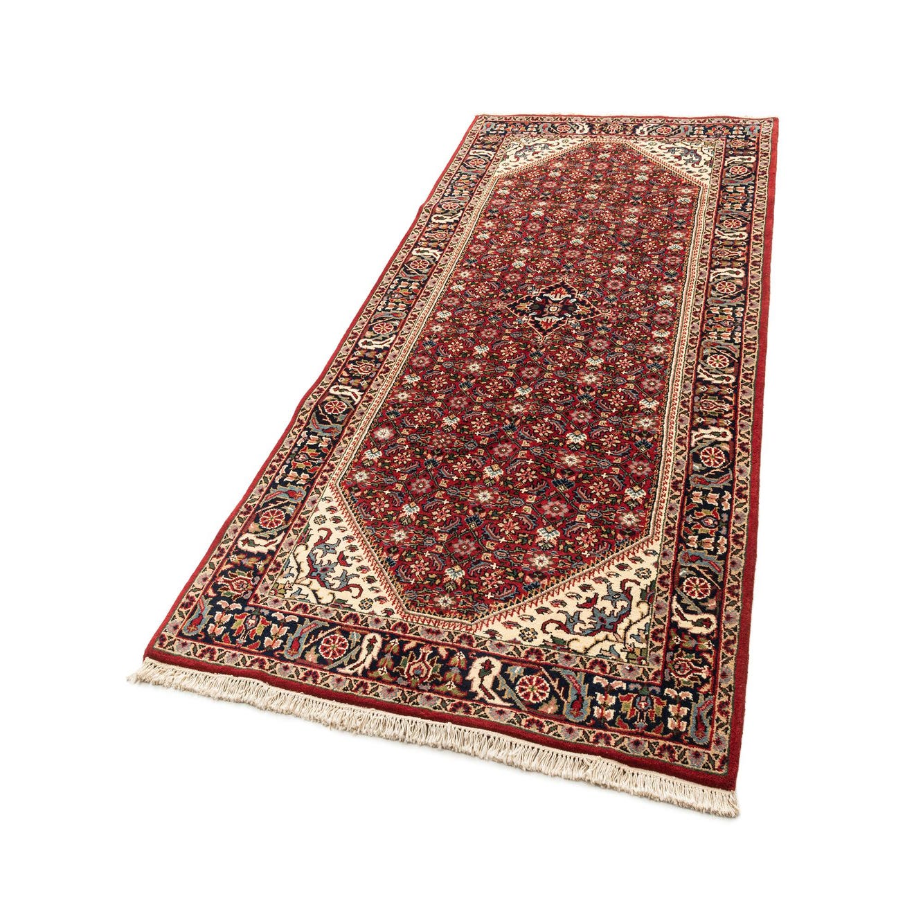 A 11 Ft runner rug in traditional Oriental style, featuring a red field with intricate floral patterns and a central medallion, framed by a dark border.