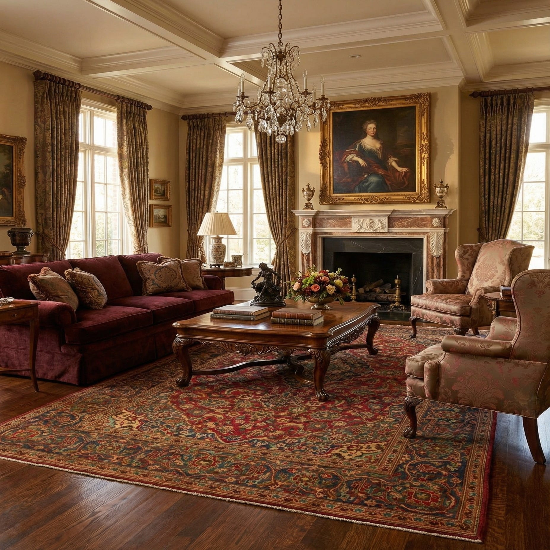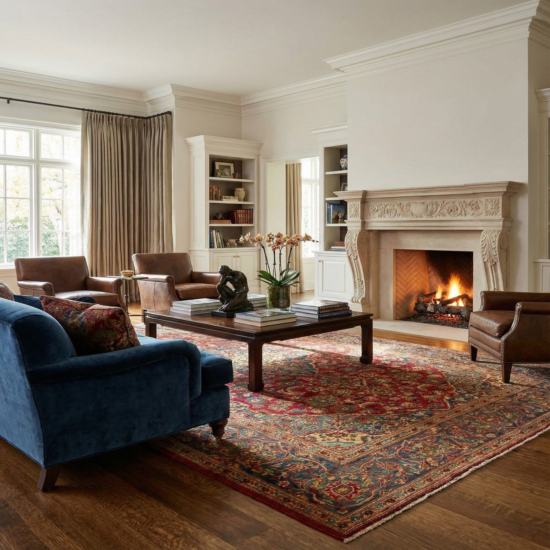This rug works well as a hallway or entry runner, anchoring circulation zones with classic pattern and color. It complements warm wood floors, leather seating, and aged brass or bronze hardware, and also brings character to a study, traditional living room, or layered in an eclectic, modern interior to add color and pattern.