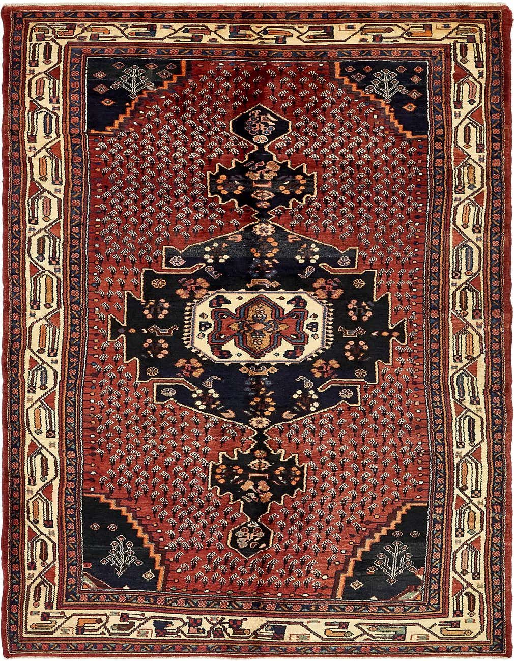 Primary color is Red. Colors in this rug include: Red, Blue, Green, Ivory, Olive, Peach, Burgundy.