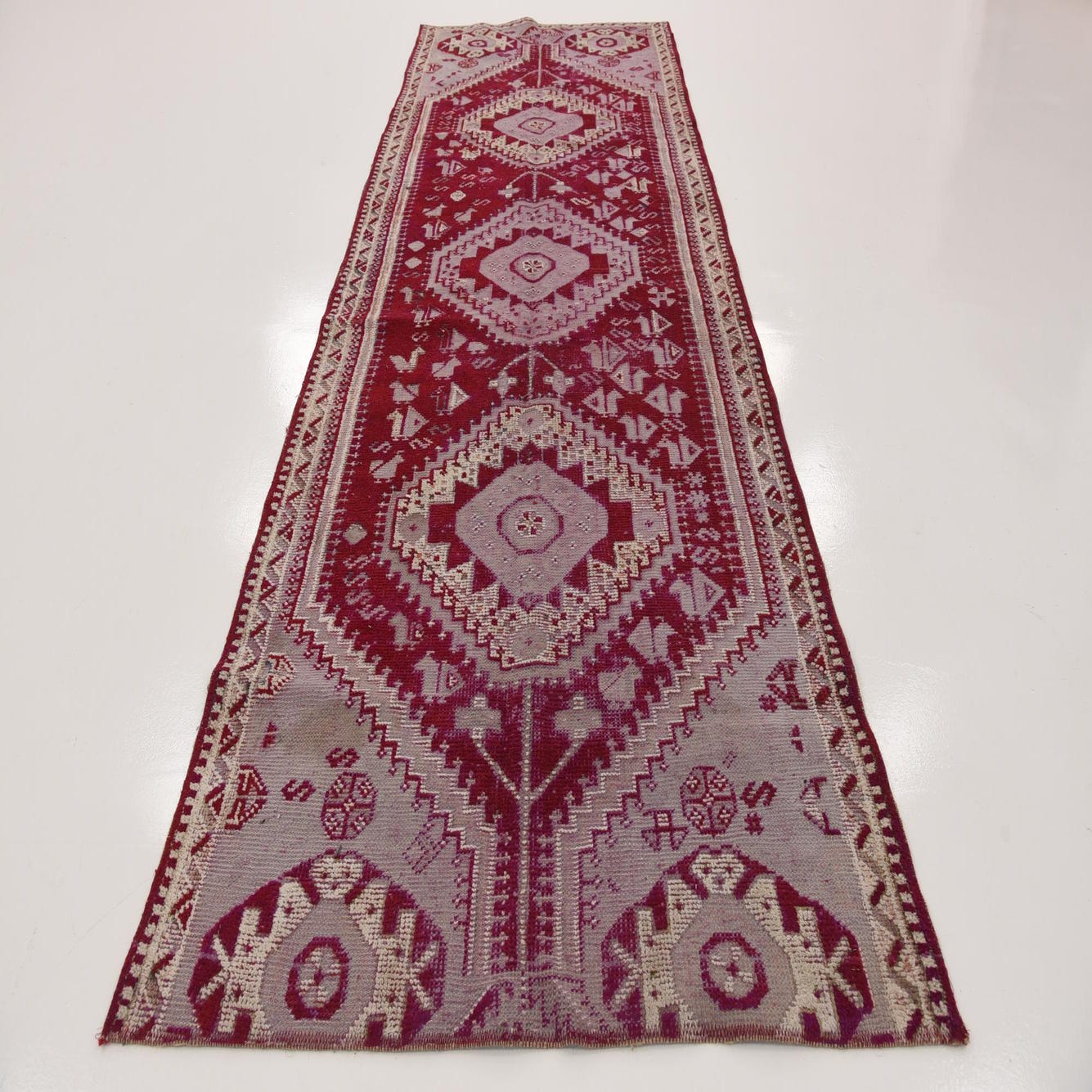 A long 11 Ft runner rug in reds with a vintage tribal botanical pattern, ideal for a hallway.