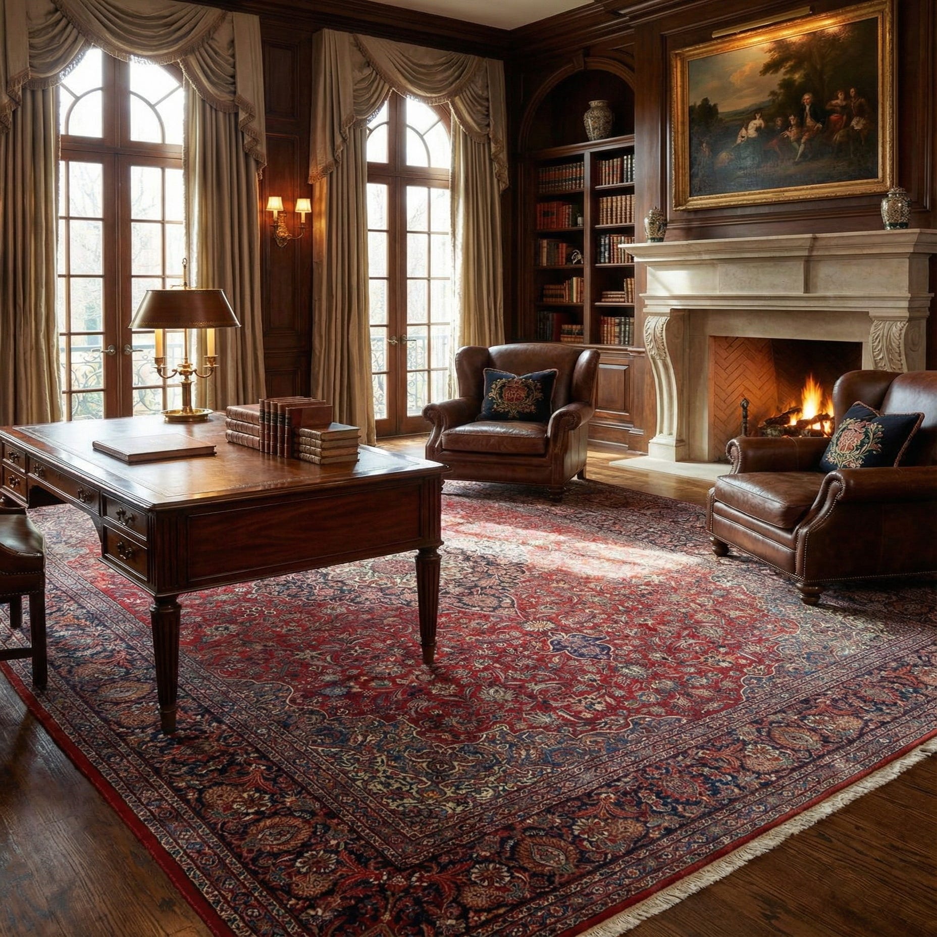 The Kashan collection presents a hand-knotted 11 Ft Square rug crafted from 100% wool, offering a balance of exceptional durability and tactile comfort. This piece features a rich red background accentuated by a classic pattern that incorporates a harmonious blend of blue, peach, and brown hues. Intricate designs form an elegant central medallion, framed by detailed borders that exhibit the timeless appeal of traditional Persian motifs.