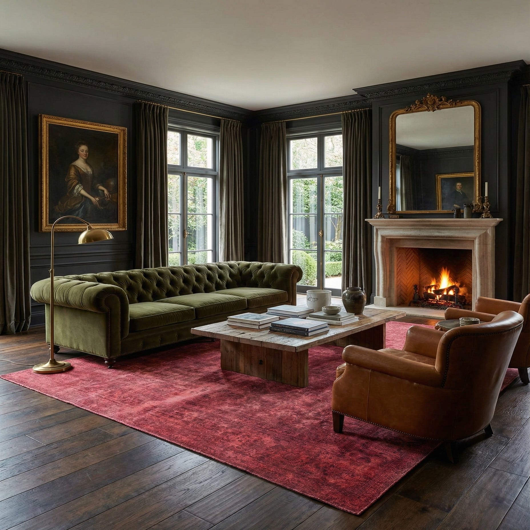 A large 11' 2 x 12' 5 square red Persian-style wool rug with a distressed vintage look and subtle medallion pattern.