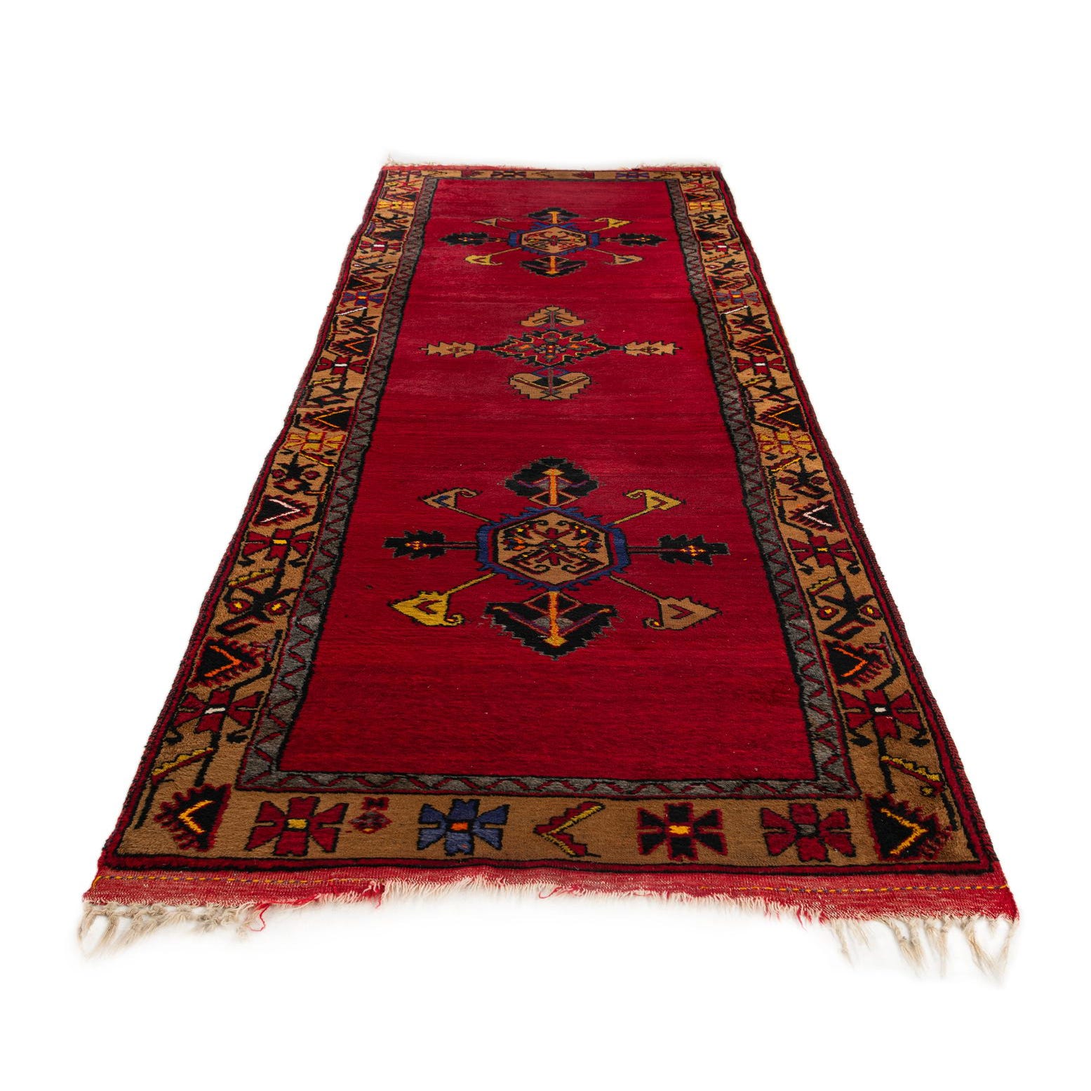 A 12 ft Anatolian runner rug in deep red, featuring traditional Oriental motifs and a detailed border.