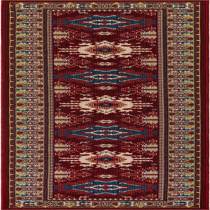 Primary color is Red. Colors in this rug include: Red, Ivory, Navy Blue, Yellow, Pink.
