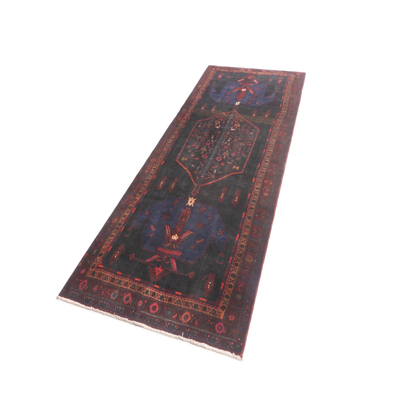 This hand-made Hamedan wool runner measures 12 feet in length and boasts a vibrant and traditional pattern. The dominant red background is complemented by deep tones of burgundy, dark blue, brown, green, and touches of pink, creating a rich, color palette ideal for adding warmth and character to a space.