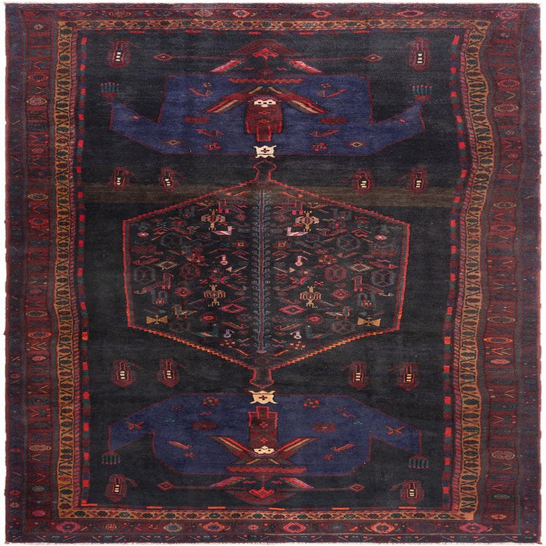 The rug features a symmetrical design with geometric and abstract motifs that are indicative of the Hamedan style. Intricate borders frame the central field, which together exude a sense of time-honored craftsmanship and attention to detail.