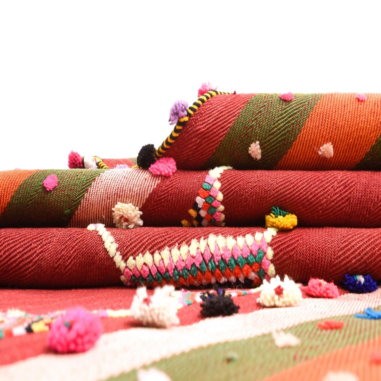 A 12 ft red Persian runner rug with a central column of colorful diamond patterns and striped borders with pom-poms, ideal for a hallway.