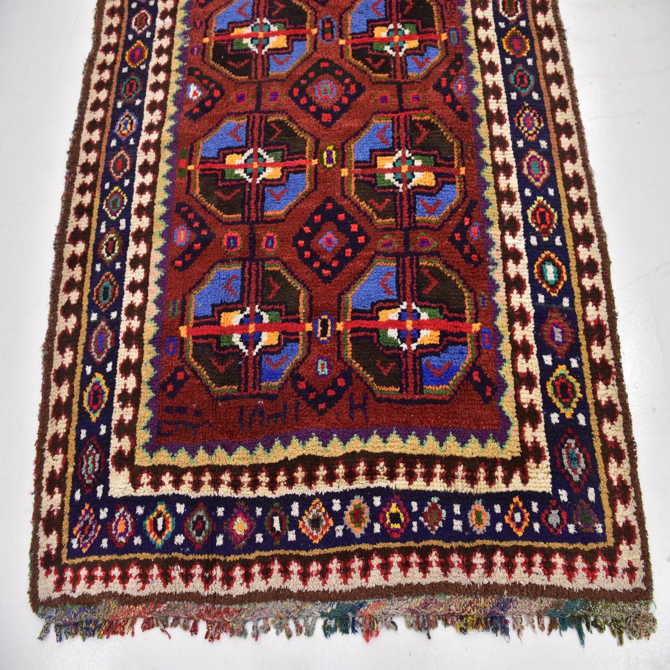 A 12 ft red wool runner rug with a tribal geometric pattern in blues, blacks, and yellows, perfect for a hallway.