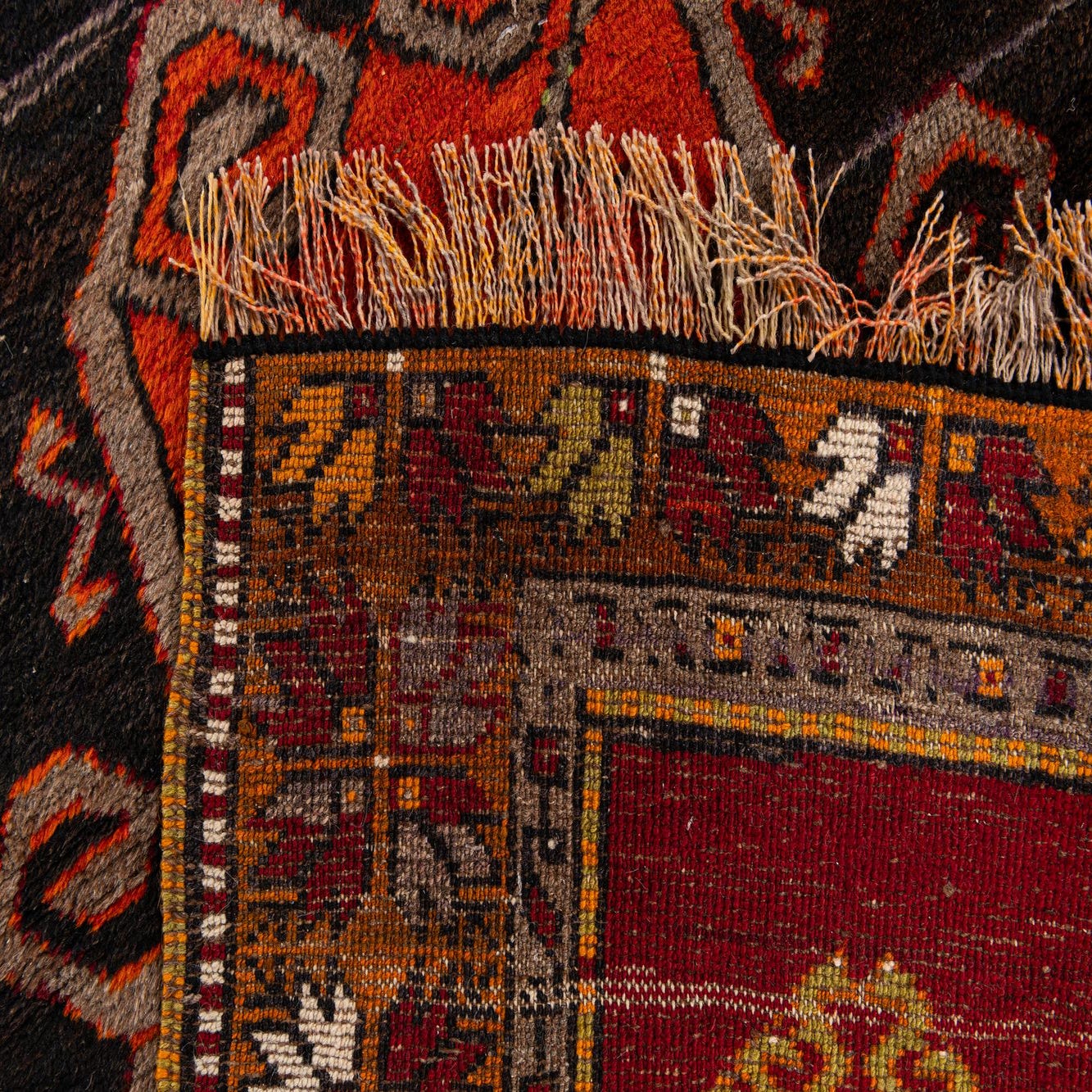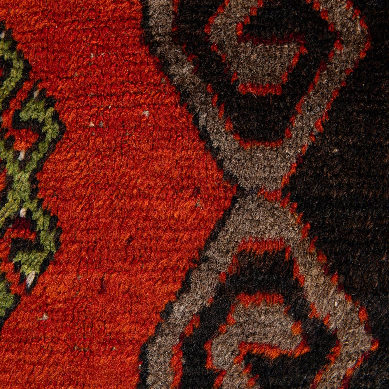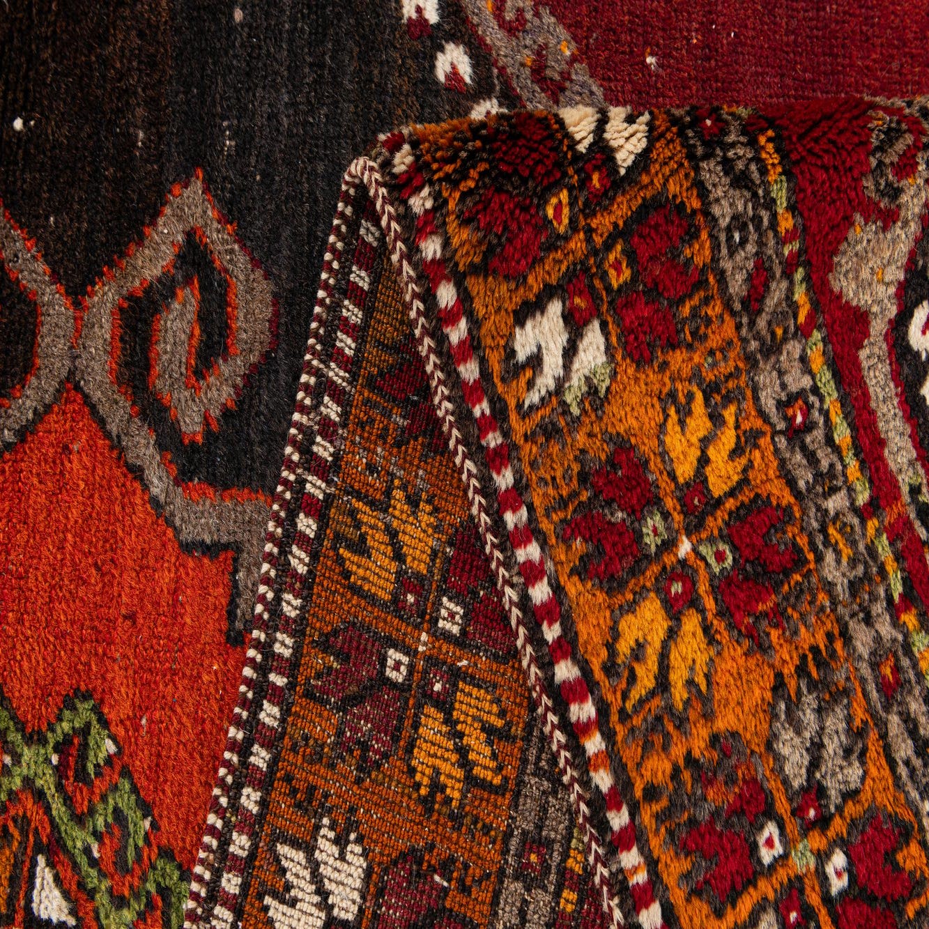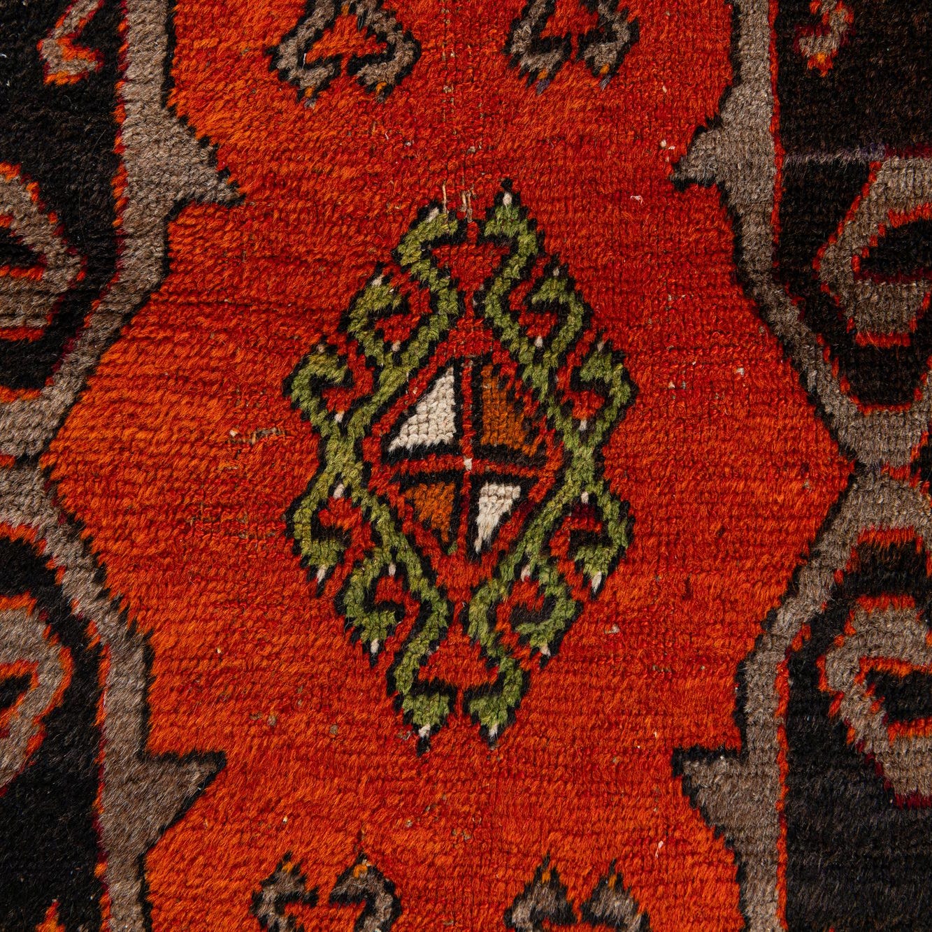 A 13 ft Anatolian runner rug with a deep red background and black, orange, and cream oriental patterns.