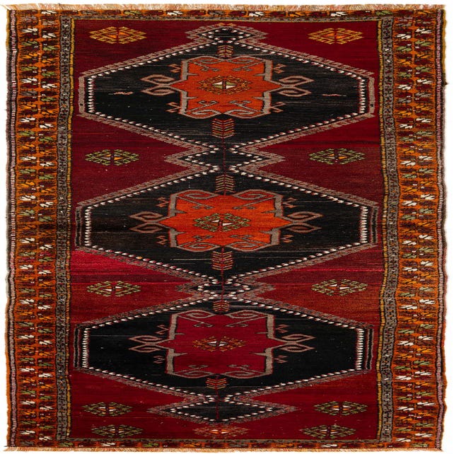 Primary color is Red. Colors in this rug include: Red, Black, Green, Ivory, Orange, Brown.