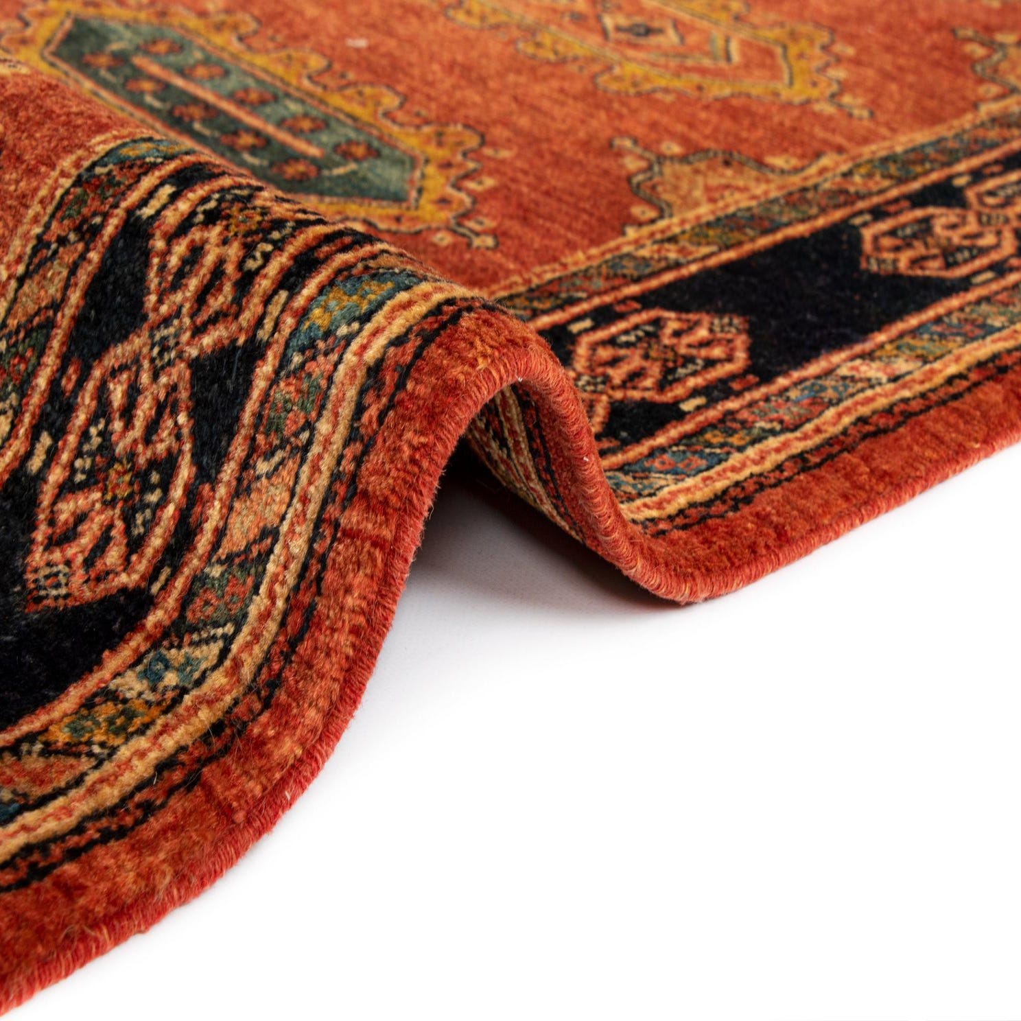 A 13 ft handmade Persian runner rug in shades of red, black, and gold with intricate geometric patterns.