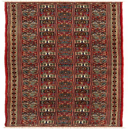 The rug's edges are framed with multiple borders that exhibit a detailed pattern, serving to both contain and complement the central design. The density of weave and handcrafted quality are evident in the rug's texture, promising both comfort and resilience.