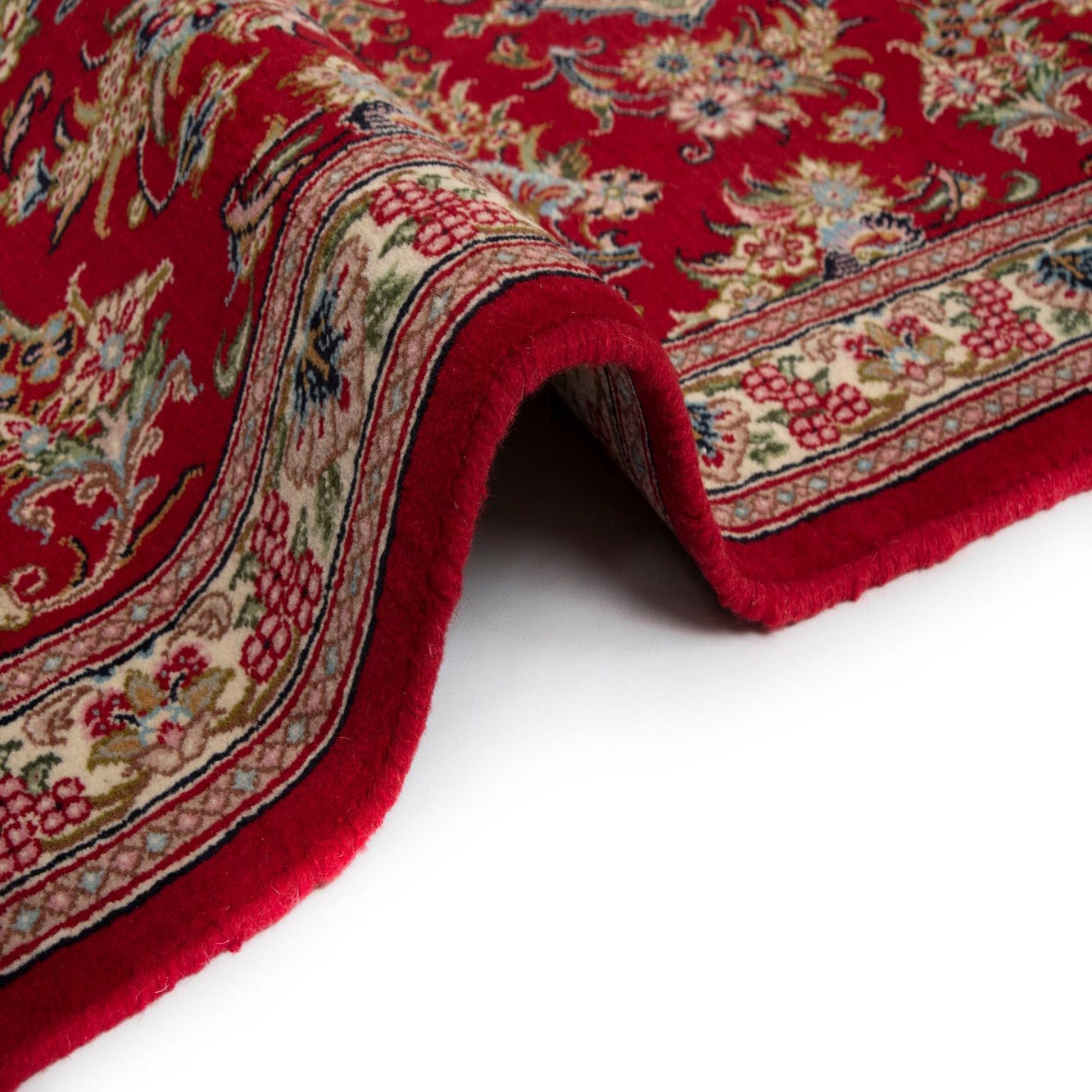 The Tabriz collection presents a handcrafted 13-foot runner rug made from natural wool. This piece boasts a central medallion pattern, flanked by ornate floral motifs and intricate vines, all set against a rich red background. Complementary colors featured in the design include cream, dark blue, lighter shades of blue, brown, and olive, which together create a harmonious and classic look. The texture of the wool provides a soft and inviting feel underfoot.