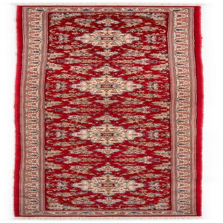 Primary color is Red. Colors in this rug include: Red, Red, Cream, Dark Blue, Blue, Brown, Olive.
