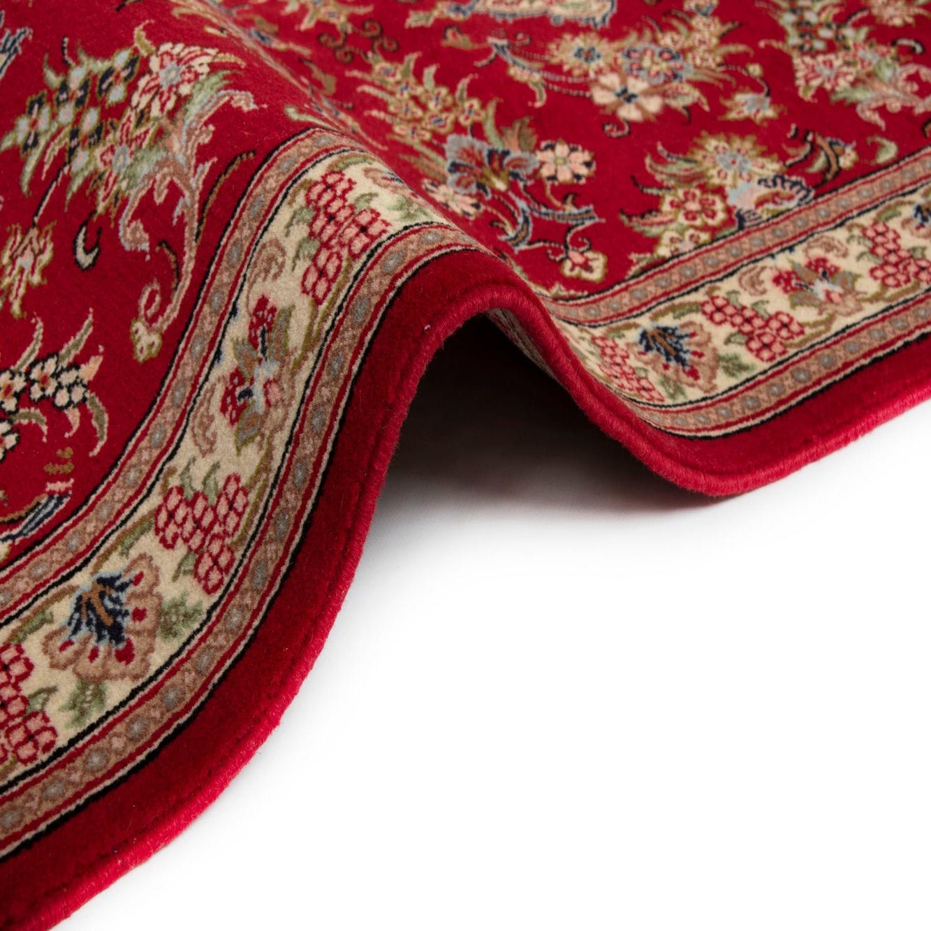 Primary color is Red. Colors in this rug include: Red, Red, Cream, Dark Blue, Blue, Brown, Olive.