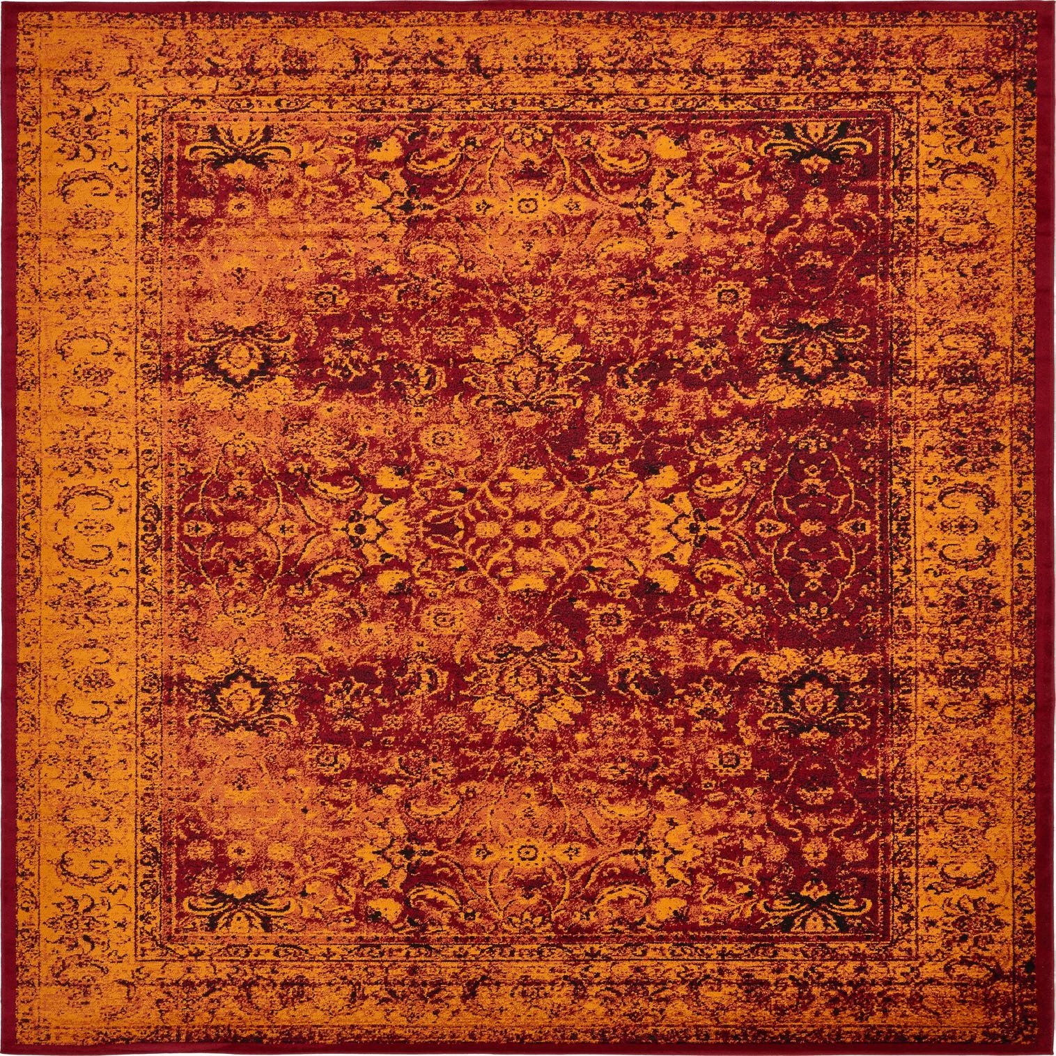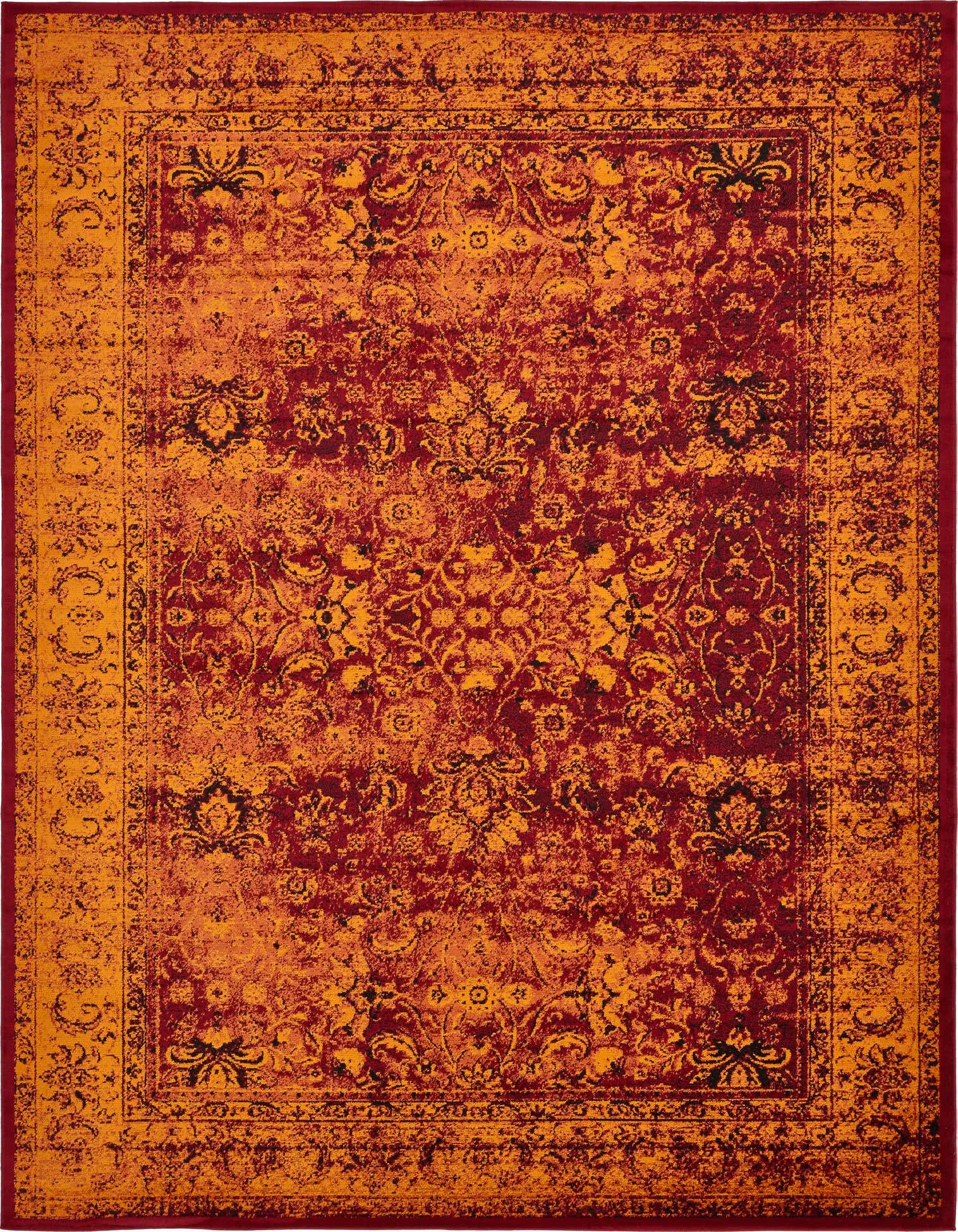 Primary color is Red. Colors in this rug include: Red, Black, Orange, Yellow.