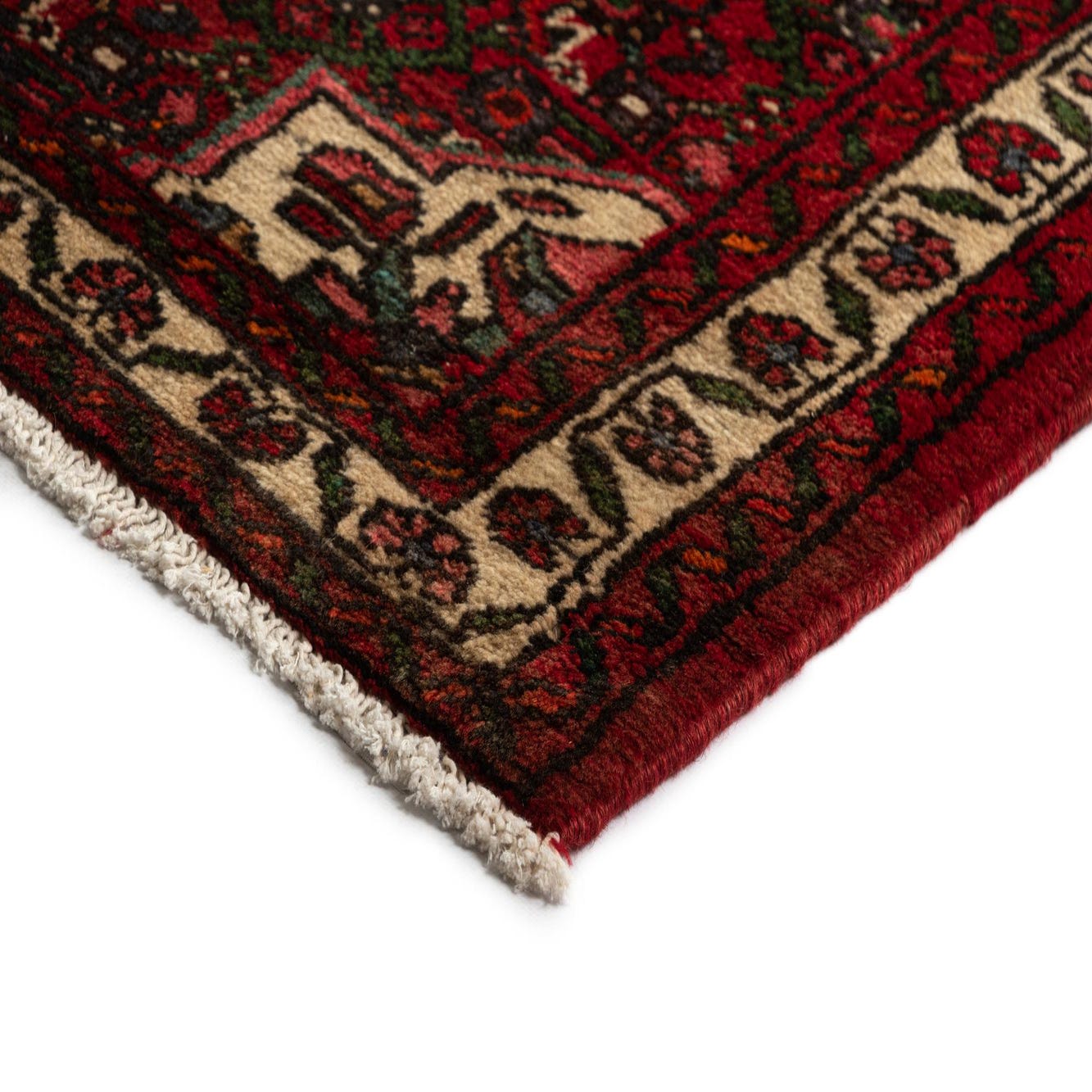 A long, narrow 16 ft Hossainabad runner rug in deep red with intricate tribal Persian patterns and a cream border, ideal for a hallway.