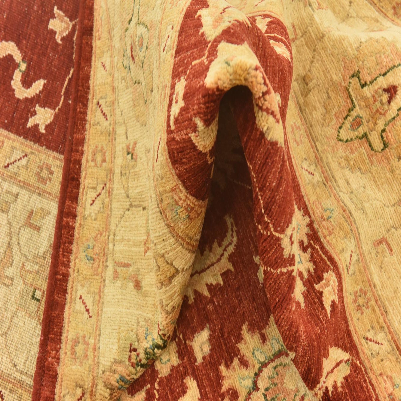 The Kazak Collection 16 Ft Runner rug presents a traditional design with a rich red background, adorned by an array of floral motifs and geometric adornments in hues of beige, blue, brown, cream, green, and peach. These colors complement the red base, creating a vivid tapestry that captures the essence of classic rug artistry. Hand knotted from 100% hand spun wool, this runner offers a sense of luxury and endurance.