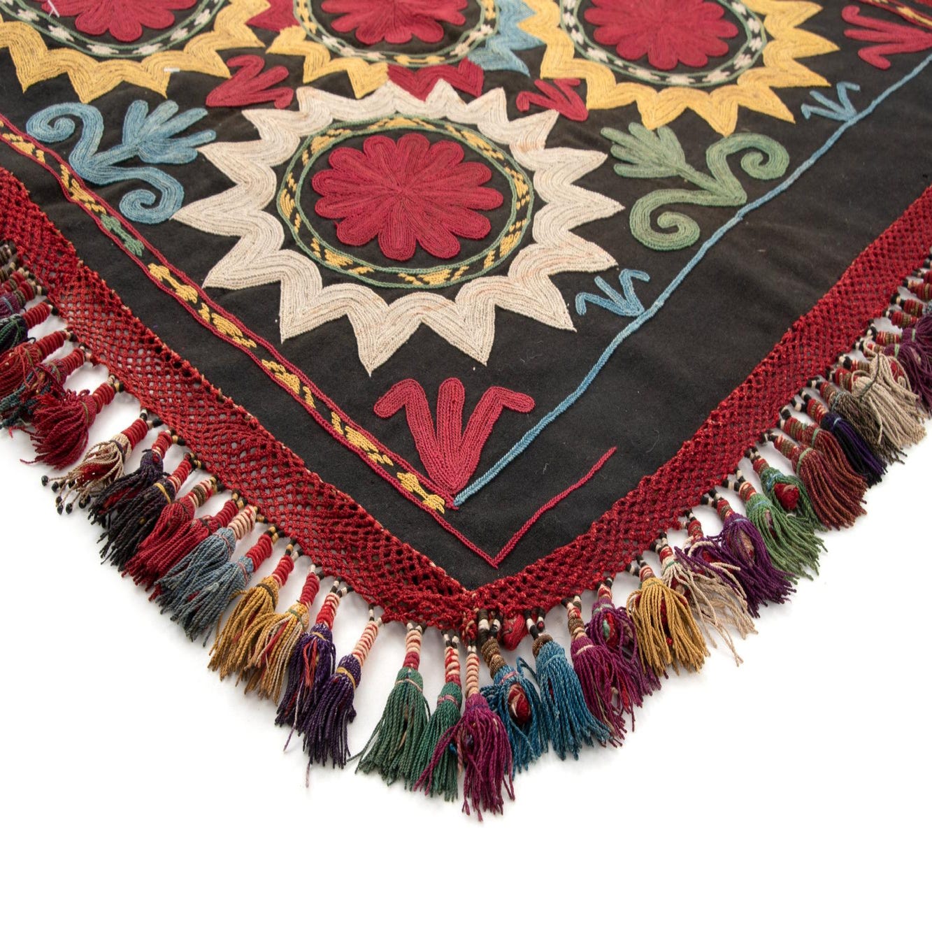 A square Lakai Persian rug, 1'10" x 1'11", featuring a black background with vibrant red, yellow, and cream floral medallions and colorful tassels.