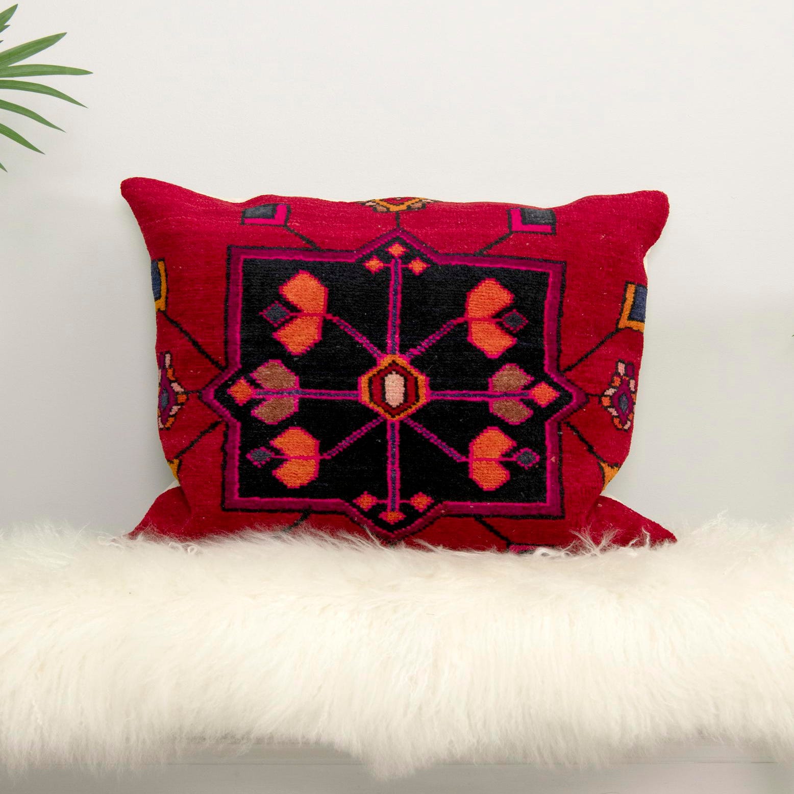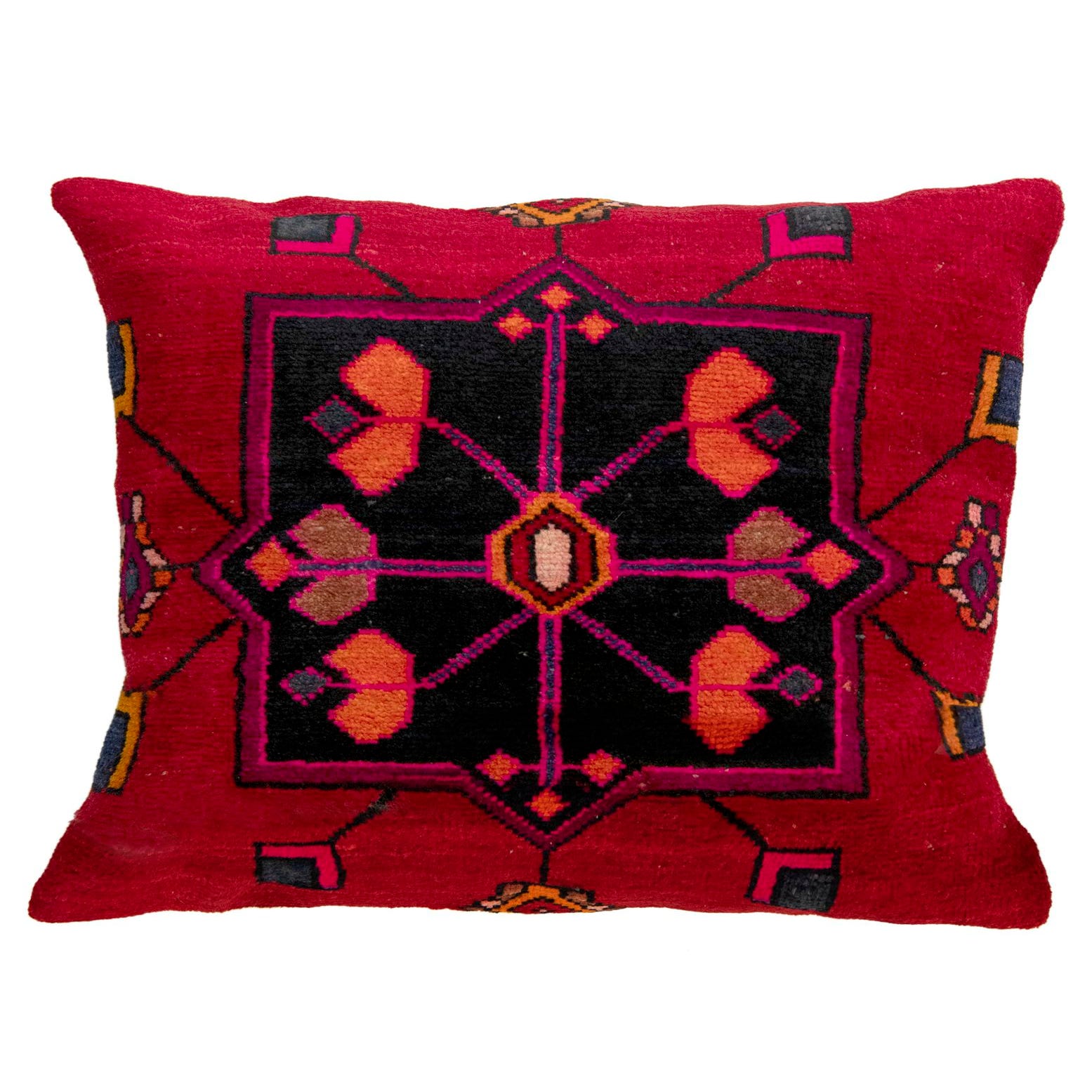 Primary color is Red. Colors in this rug include: Red, Black, Orange, Pink, Ivory, Navy Blue.